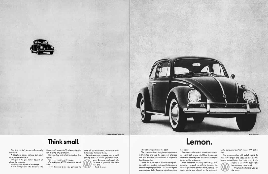 黑白色的版面也比彩色版面要便宜,也与甲壳虫的经济适用性的特点相对应。“Think Small”被美国广告业媒体 Ad Age 评为世纪最佳广告策划 100 例中的第一位,这种风格至今在广告行业广泛使用。