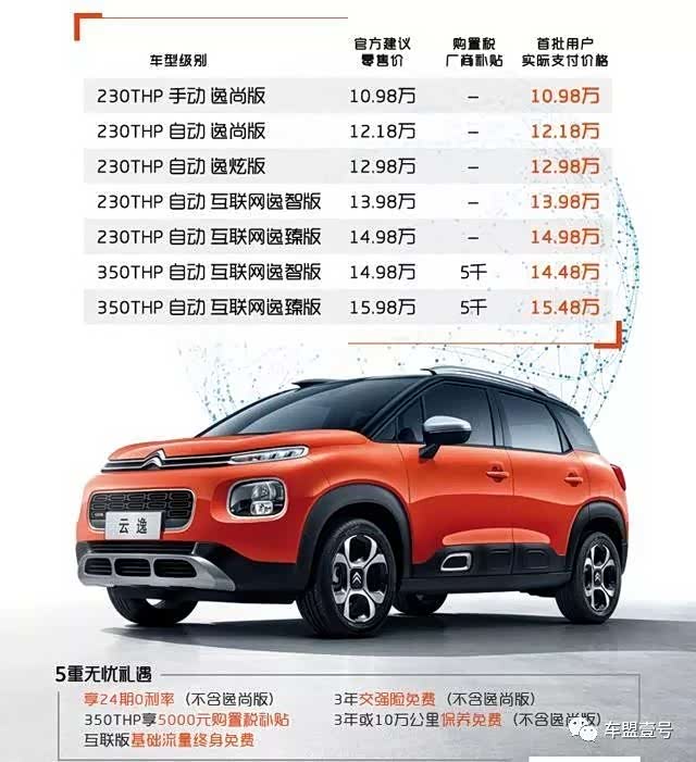 东风雪铁龙云逸推出了230THP和350THP两种动力共7款车型,官方指导售价为10.98-15.98万元。其中互联网版本售价区间13.98-15.98万元。除了令人心动的售价,东风雪铁龙还针对首批2018年交付的前10,000名车主提供5重无忧礼遇:包括24期0利率、3年交强险免费、3年或10万公里保养免费、350THP享5,000元购置税补贴、互联版基础流量终身免费(以上均不包括逸尚版)。