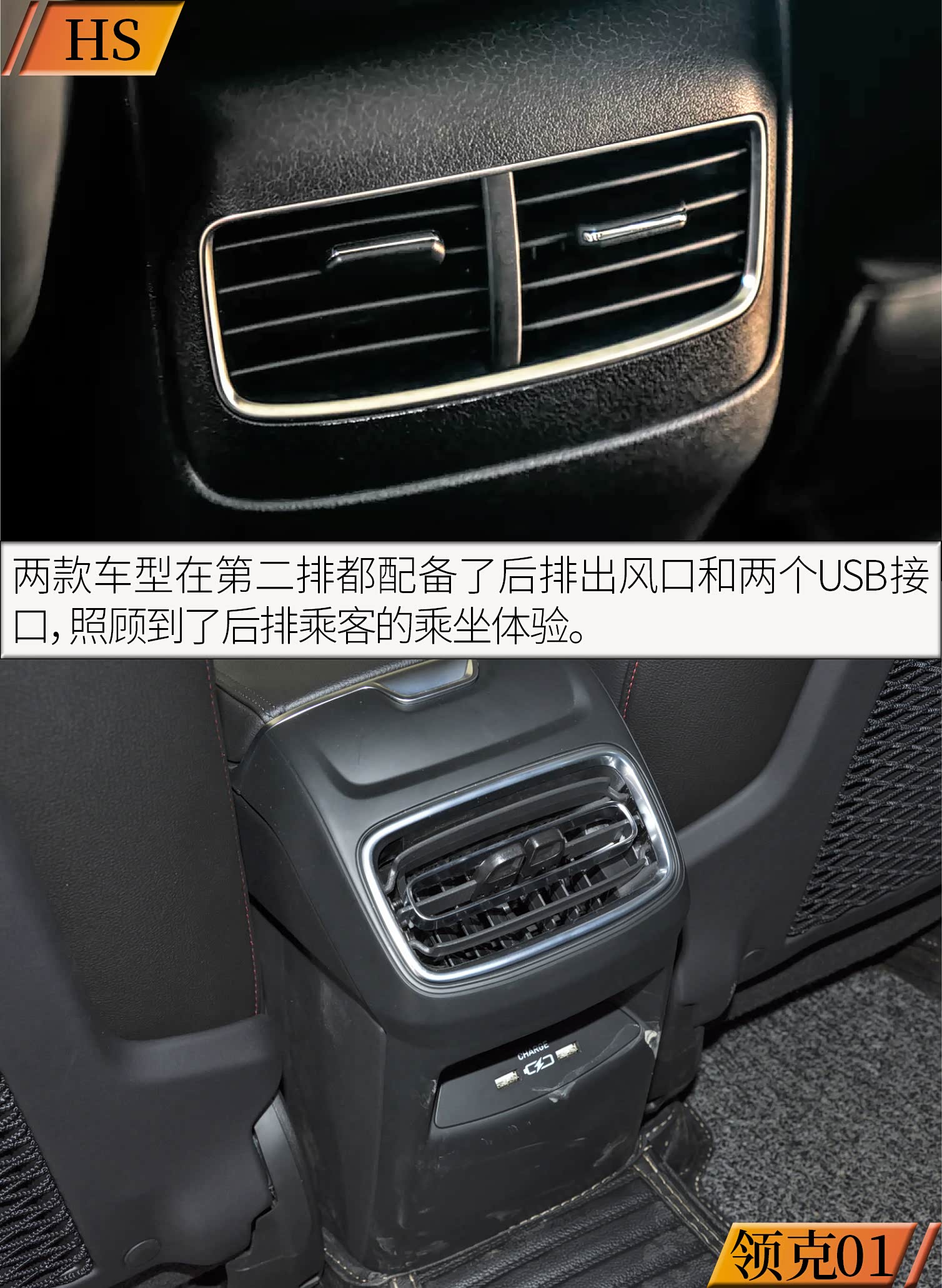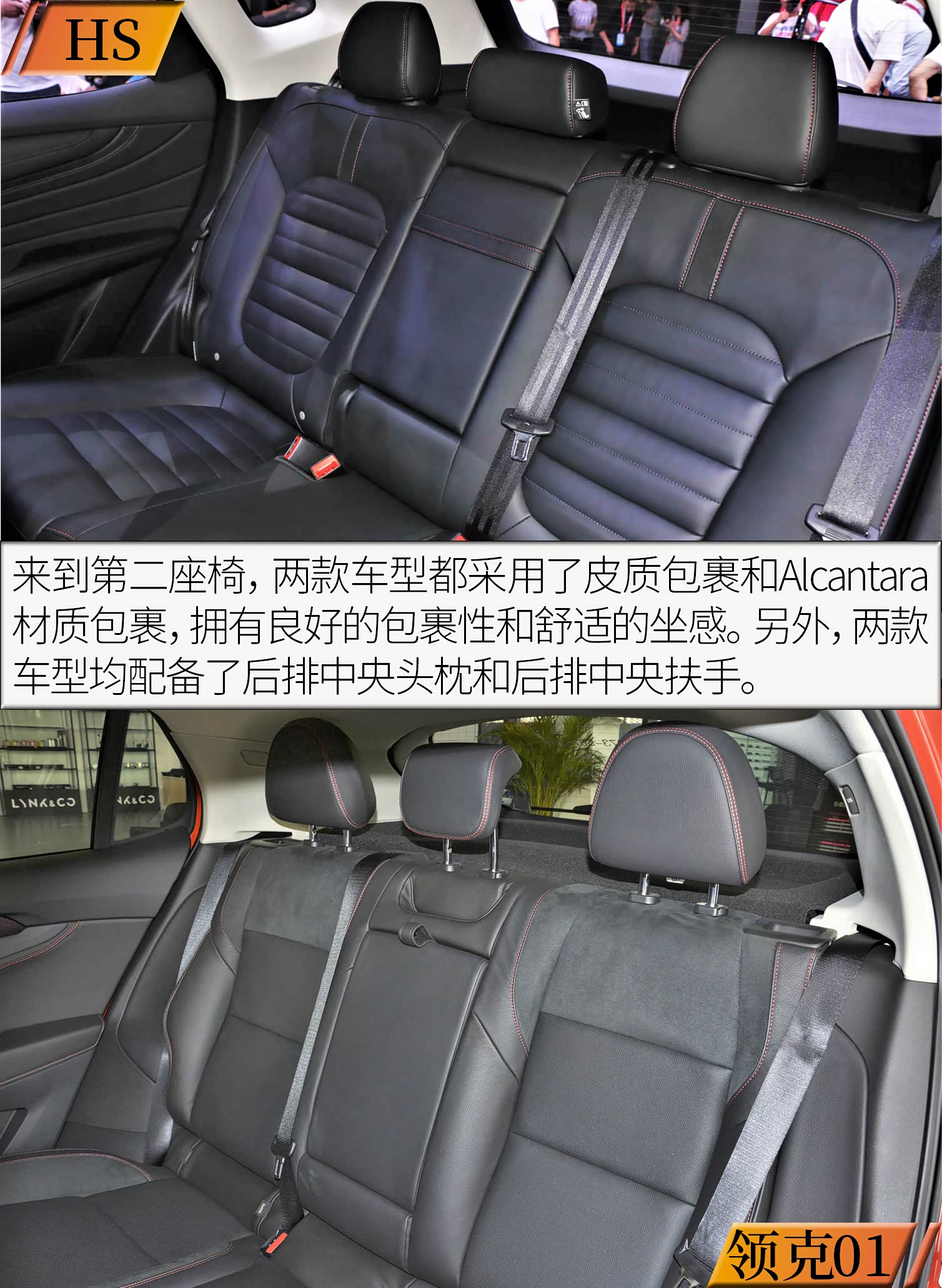 两款车型在空间上都处于同级主流水平,并且在座椅和配置上保持高度一致。在座椅方面,两款车型都采用了一体式运动座椅,同样运用了皮质和Alcantara材质包裹,为身体提供了良好的包裹性。与此同时,主副驾驶座电动调节和腰部支撑两款车型也均有配备。在后排乘客的照顾上,名爵HS和领克01也都配备了后排中央头枕、后排中央扶手、后排出风口以及两个USB接口。