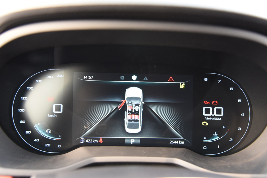 12.3英寸液晶组合仪表盘在如今已经算不上是新奇配置,中央的7英寸彩色液晶屏除了显示车辆信状态、胎压、胎温等行车电脑信息,还可以与多媒体系统互通,通过方向盘的按键在仪表内查看导航、音乐、收音机等功能。