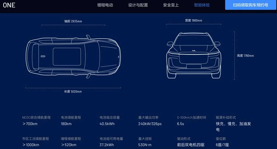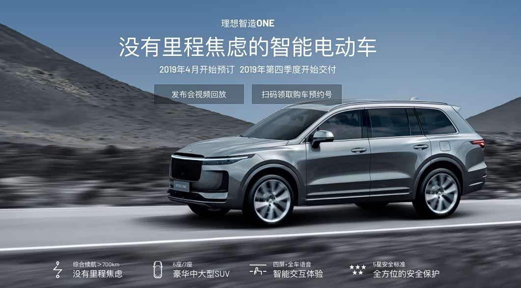 理想智造ONE定位高端中型SUV,补贴前价格不高于40万,只有一个全功能配置,采用增程式电动系统,NEDC综合续航里程超过700公里。发布即日起开启免费预约,19年4月起支付定金,19年第四季度在北上广深等城市启动首批交付。