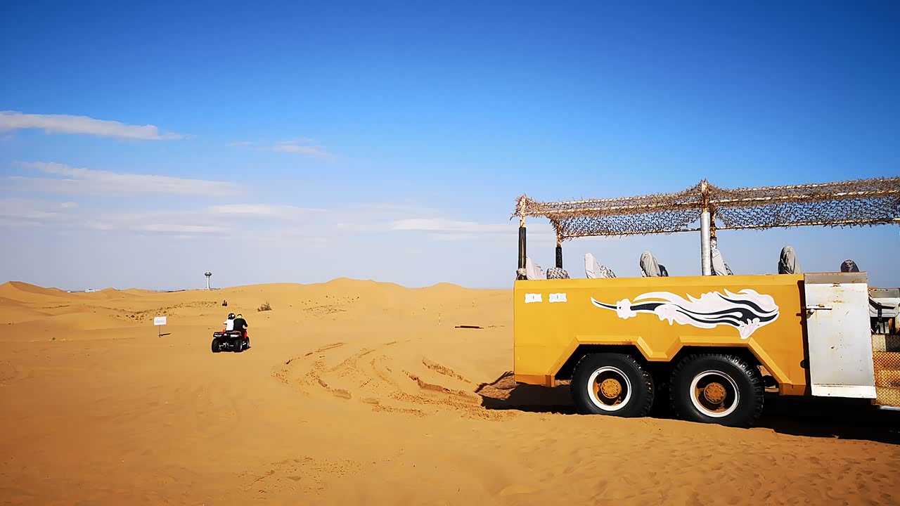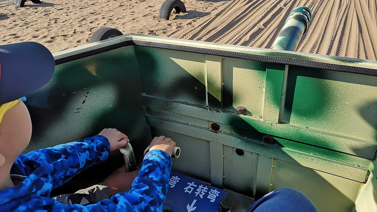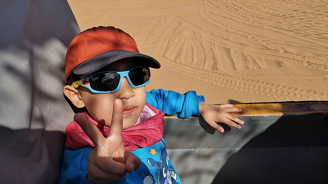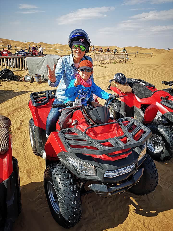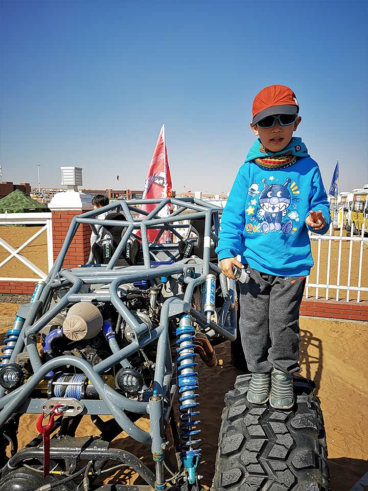 沙丘上面玩完,去玩沙漠项目,老婆和孩子去骑沙漠摩托。因为带孩子,只能工作人员骑,他们坐着。据老婆讲,工作人员开得很快,儿子还欢呼来着,但突然哭了。当时我老婆问他是害怕吗?儿子说不是,因为帽子飞了,丢了。然后我老婆回他帽子在我手里呢,儿子就又继续欢呼雀跃了……