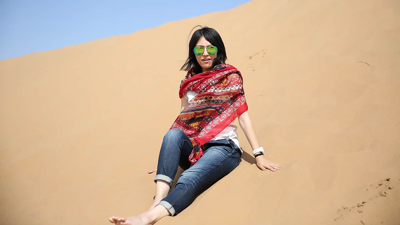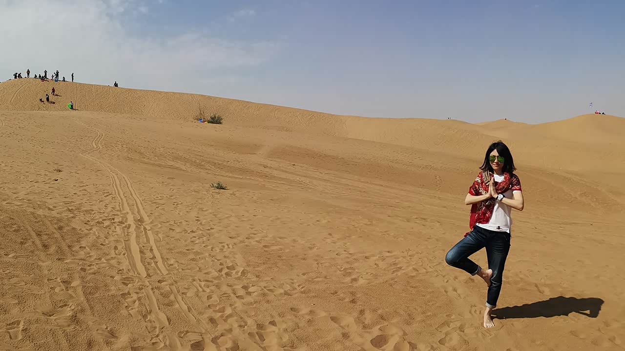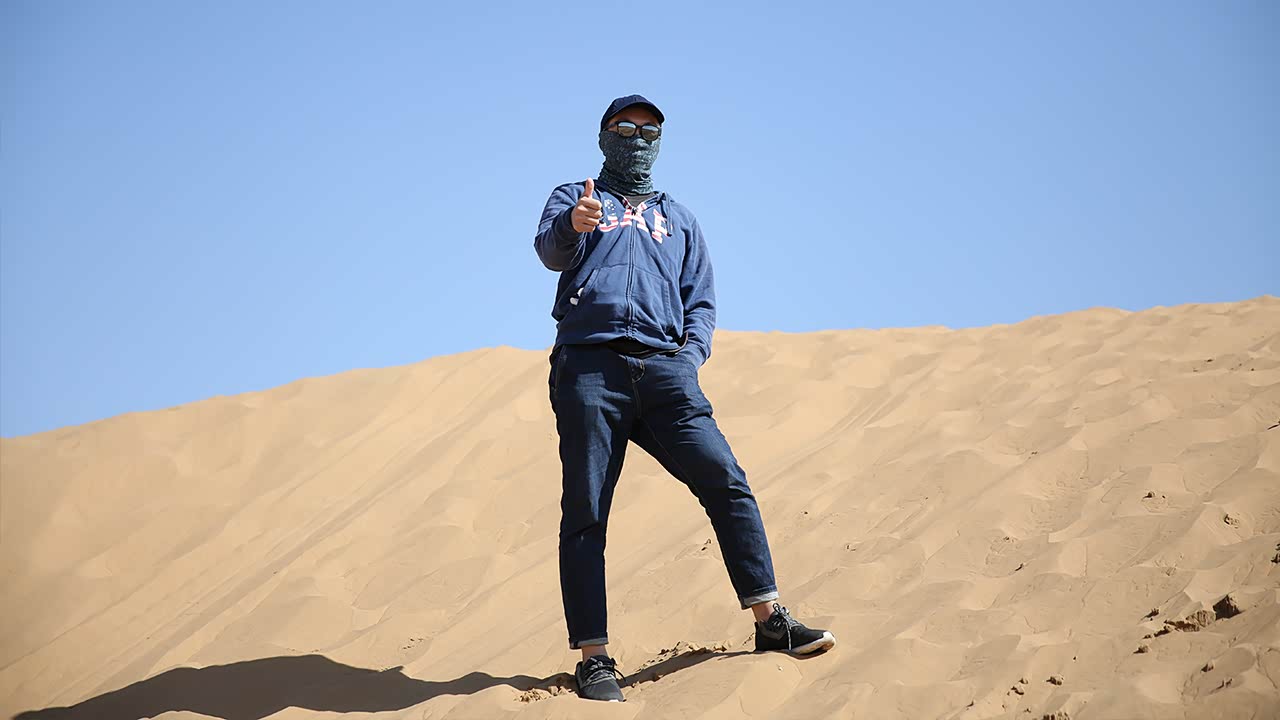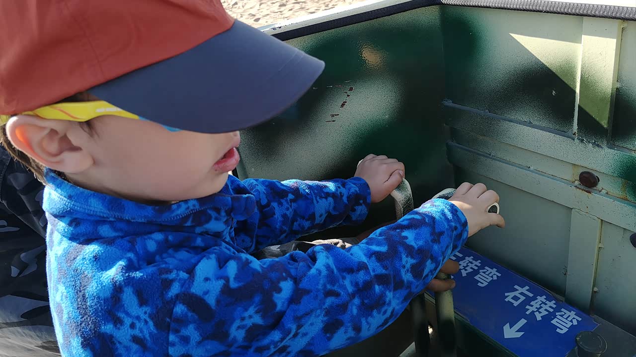 沙丘上面玩完,去玩沙漠项目,老婆和孩子去骑沙漠摩托。因为带孩子,只能工作人员骑,他们坐着。据老婆讲,工作人员开得很快,儿子还欢呼来着,但突然哭了。当时我老婆问他是害怕吗?儿子说不是,因为帽子飞了,丢了。然后我老婆回他帽子在我手里呢,儿子就又继续欢呼雀跃了……