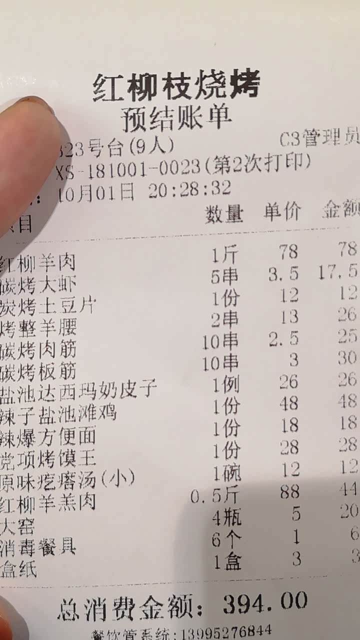 不仅肉嫩,而且一口下去满嘴留香,一斤78元,能穿10串左右,我们要了一斤普通的,还要了一斤88元的羊羔肉,简直棒极了。吃完结账发现价格挺合理,五个大人两个孩子,吃了394。