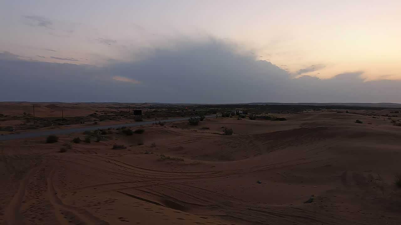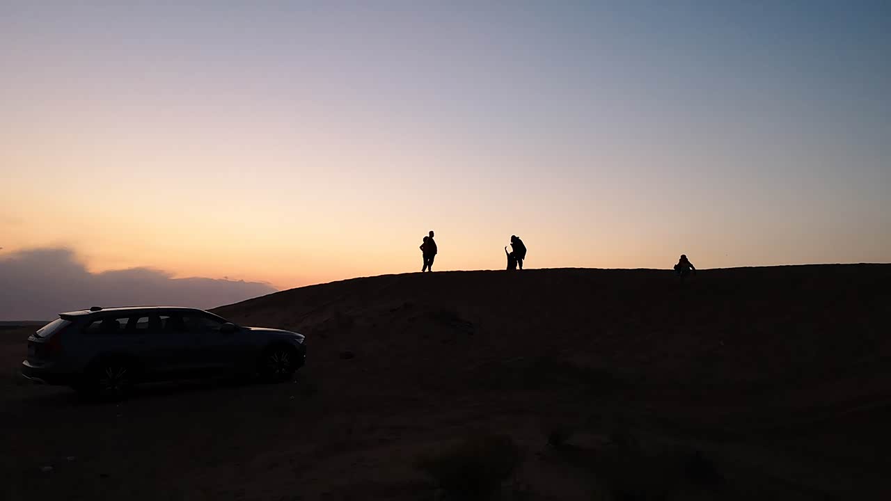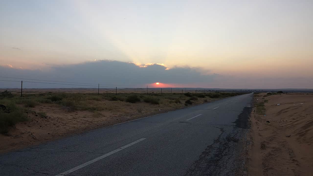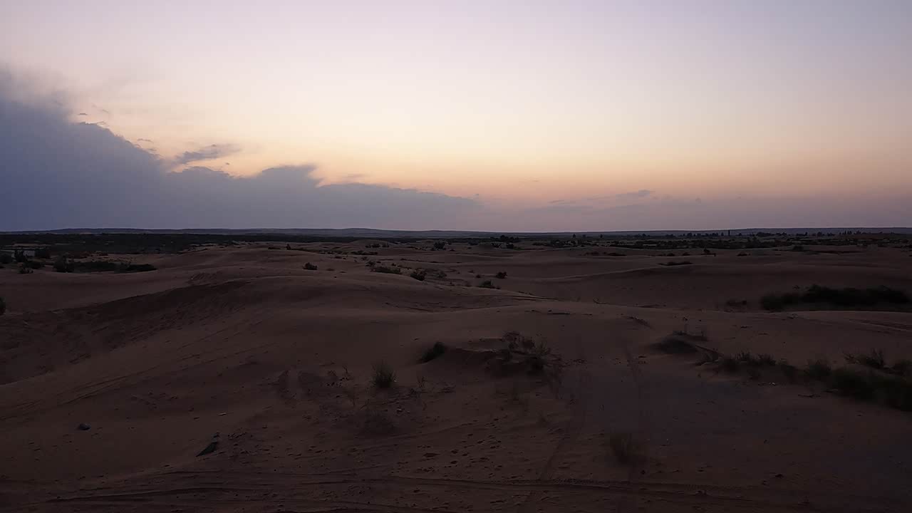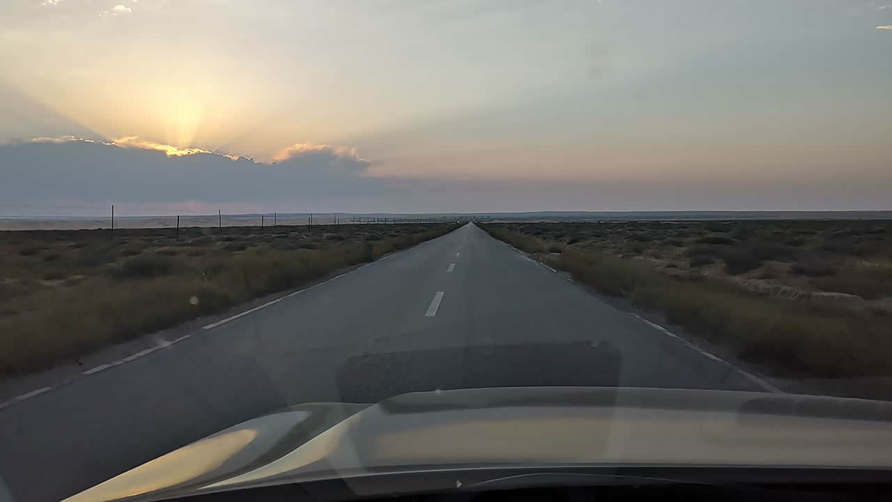 开到一半的时候,能看到一个特别有趣的地貌特征,前面是沙漠,后面是草原,我们就在分界的这里靠边停车,下车玩耍。这条公路基本很平,偶尔有坑,车速注意控制,否则不小心把轮胎颠坏了会造成不必要的麻烦。一路上一百多公里只看见不超过10辆车。下车以后可以拍拍照,但旁边有铁丝网的地方尽量别越过去。此时正好赶上夕 阳西 下,美极了。
