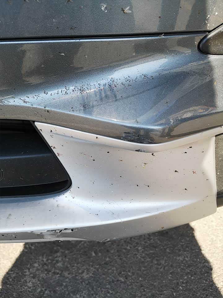 我停车的地方,旁边有棵树,我倒车躲着树走,发现后面太窄,往前上一把,没注意树前面还有个那么大的石墩子,那么大。就听见“咚”一声……下车检查伤势,蹭到的地方是保险杠上凸出来的。
