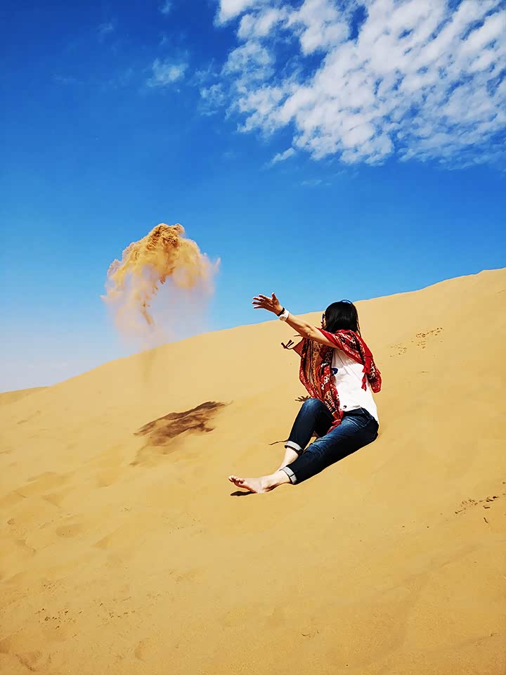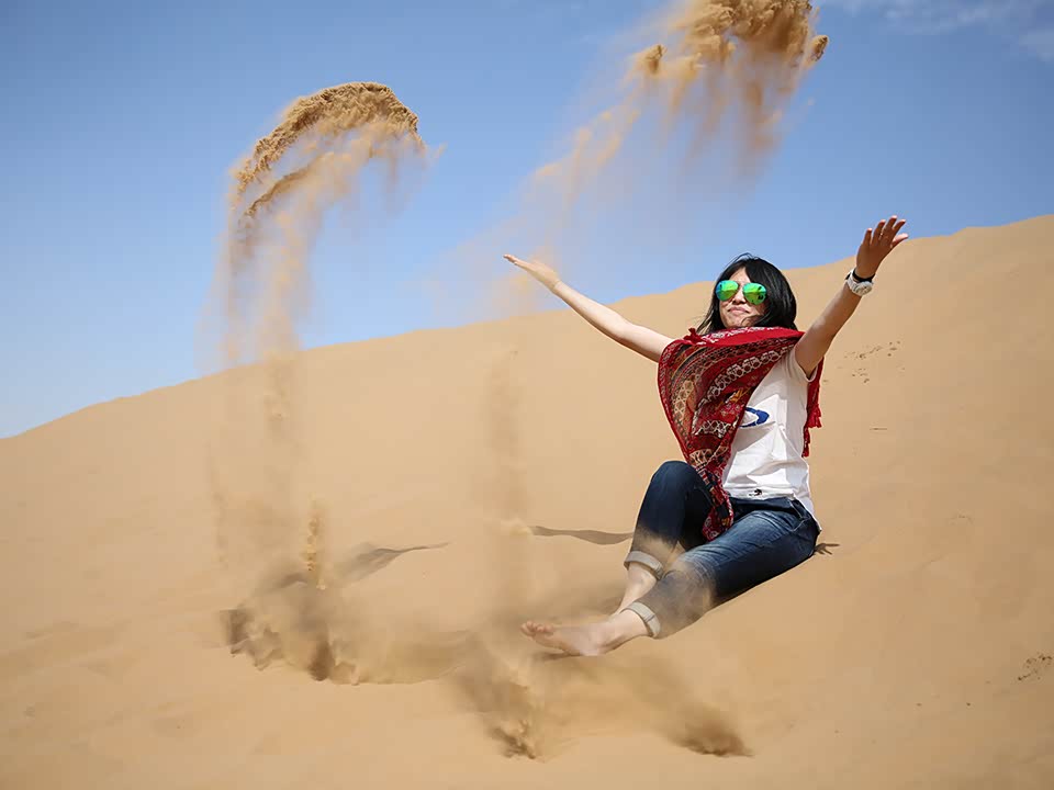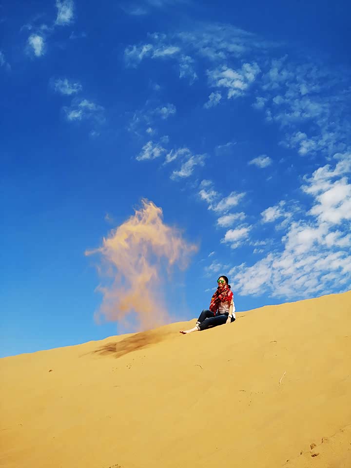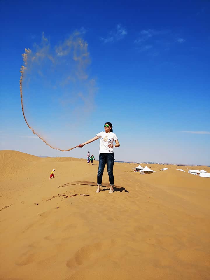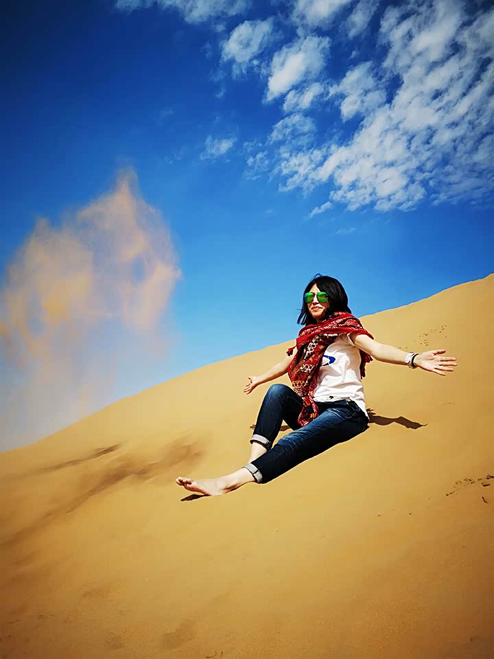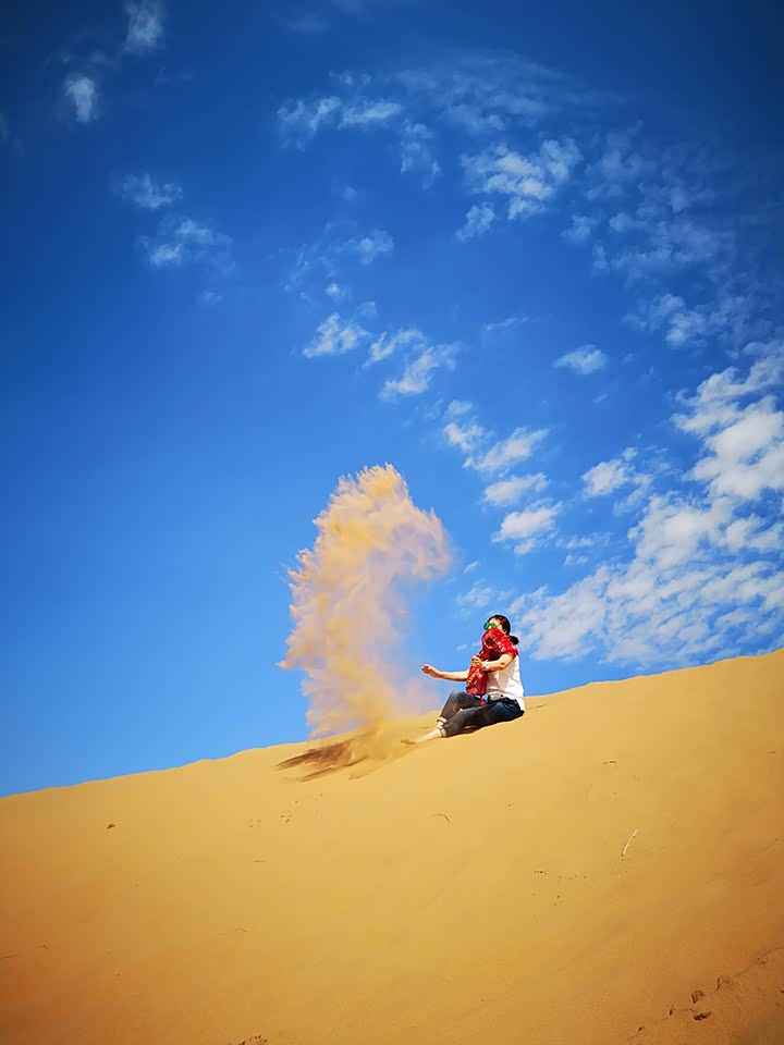 这里有个小插曲,去景区的大路两边有卖滑沙板的,前面的喊40块钱,一家一家砍价,在后面找到一家25搞定。而且有心的同学能了解,用完了出来找他们,他们还能收。这个滑沙板也挺好,夏天能滑沙,冬天能滑雪,所以我的这个就不准备卖掉了,带回 北京 继续利用。金沙海景区距离 中卫 市区只有不到二十公里,这一天不用长途跋涉。到了门口有个挡车杆,看门大爷问我们是不是住宿,我们如实回答说不住,是来玩的。他直接开杆让我们进去了,停车还是免费的。到了真正的一望无际的沙漠,拍照,玩沙子,觉得快晒熟了可以去下面玩沙漠卡丁车、冲浪车、沙漠三轮摩托、滑沙、沙漠平衡车……如果你是这儿住宿的人还可以去前台拿个凭证,所有项目都半价。