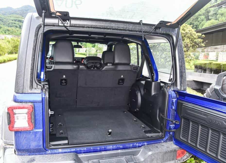 最后来到后备箱,牧马人的后备箱分上下两段打开,由于其独特的车身造型及尺寸,其后备箱的容积也是比较巨大和规整,同时其后排座椅也是支持四六分割放倒,从而达到一个全平地台,载物能力应该能满足你比较大的需求。