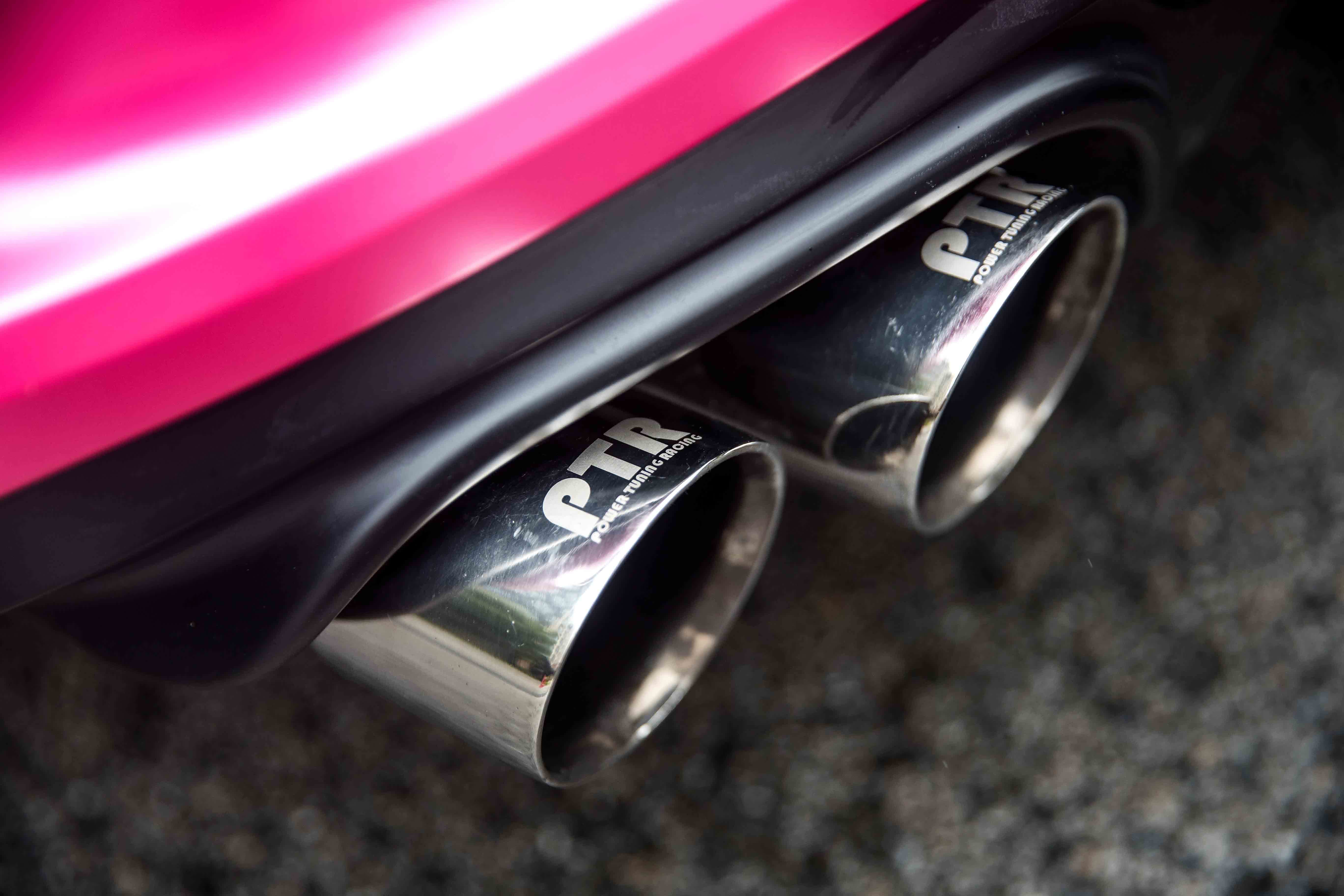 双边四出的排气让人无法将它忽视,与车身上萌萌的贴纸形成强烈的反差。改变了原来低调的双边两出排气,好像是在时刻提醒人们,这不是一辆好惹的车。