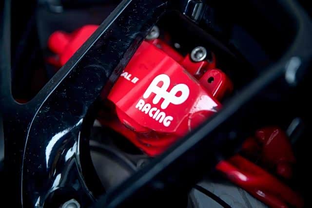 在车辆性能方面,首先要提升的便是刹车,无论这车的动力能提升到几百匹几千匹,能够在紧急情况下刹停才是最主要的,无论何时安全都要放在第一位。在车辆制动方面,名爵6做到了100-0km36米内刹停,如此出色的成绩也无法满足车主的需求,于是选择了时下热门的刹车品牌AP RACING的刹车卡钳套装,红色的前刹车卡钳搭配黑色的轮毂十分亮眼。