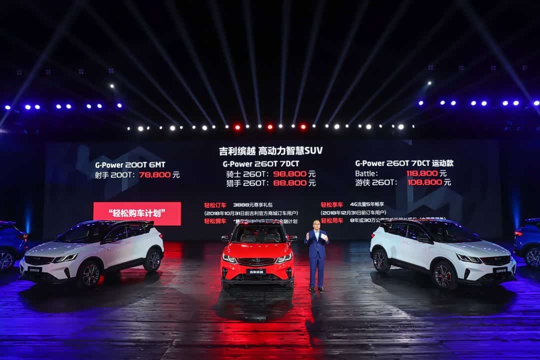当天晚上上市的是吉利BMA基础模块化架构下的首款SUV——缤越。这款以“和年轻较劲”为主题的车型,包括G-Power 260T和G-Power 200T两种排量5款车型,官方指导价为7.88万—11.88万元。