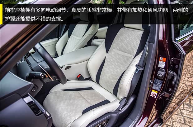 前排座椅拥有多向电动调节,真皮的质感非常棒,并带有加热和通风功能,两侧的护翼还能提供不错的支撑,不过个人并不是很喜欢白色,脏了之后很难打理。