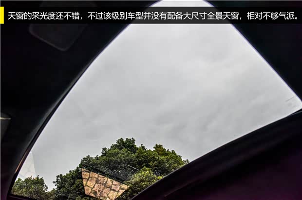 天窗的采光度还不错,不过该级别车型并没有配备大尺寸全景天窗,相对不够气派。