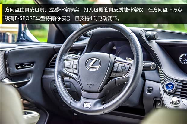 方向盘由真皮包裹,握感非常厚实,打孔包覆的真皮质地非常软,在方向盘下方点缀有F-SPORT车型特有的标记,且支持4向电动调节。