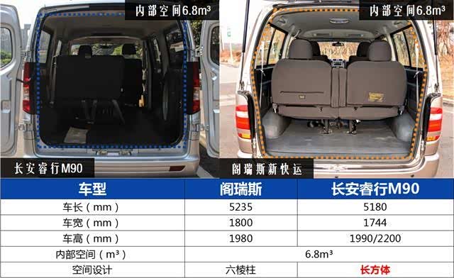 阁瑞斯车身尺寸5235*1800*1980mm,内部空间6.8m³;长安睿行M90高顶版车身尺寸5180*1744*2200mm,内部空间也达到了6.8m³,但更小的车身设计让车辆转向和道路通过性也更为出色。