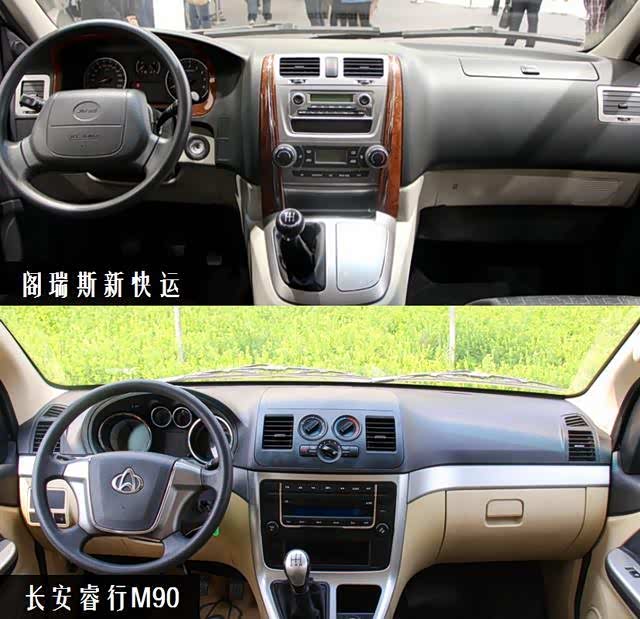 阁瑞斯快运内饰采用上身下浅的搭配方式,中控台以T字型展开,银色面板、仿桃木装饰板提升了车辆的档次感。长安睿行M90内饰设计上更显人性化,车内采用米银黑三色搭配,中控台面积较大,操作便捷。全系方向盘可上下调节,仪表盘设计采用全液晶数字仪表,显示清晰,科技感十足;车辆显示屏采用蓝光背景,夜间使用观览舒适;显示屏外围通过镀铬提亮,收放机加大了按键与旋钮尺寸,日常使用更方便。