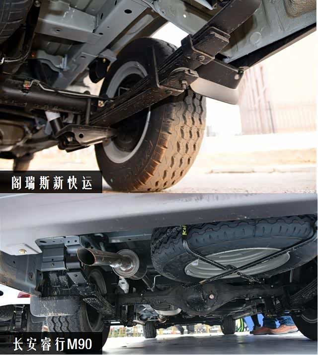 长安睿行M90与阁瑞斯均采用钢板弹簧非独立悬架,此类结构也是货运车中较为主流的搭配。阁瑞斯新快运弹性元件数为3片钢板弹簧,采用6308后桥,满载条件下最多可达1500KG载重,面对日常货运,承载力还是十分强大的。长安睿行M90通过科学合理轻量化设计,比阁瑞斯整备质量轻285Kg,但承载却比阁瑞斯更高。不仅弹性元件数更多,达到了5片钢板弹簧,后桥采用6308-2RX加强型后桥,满载时可达1565KG,进一步提高车辆耐久和承重表现,载运力较阁瑞斯更强更稳定。
