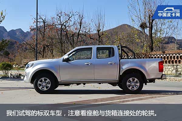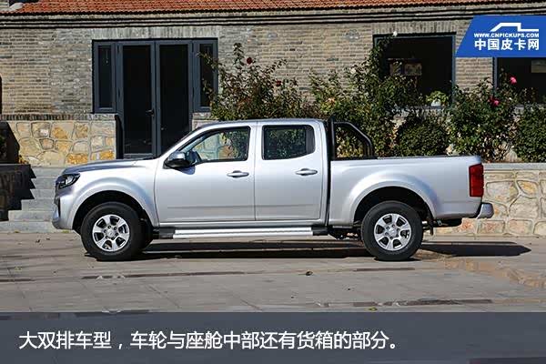 试驾当天大双排和标双车型都到了现场,最直观的辨别方法就是看后轮拱与座舱的间隔,较长的是大双排,后轮紧贴着座舱的是标双。这个方法一般同样可以用在辨别其他有大双排和标双版的车型上。另外,我们试驾的是四驱精英型(厂家给的配置表只有四驱精英型和四驱领航型两款车型,后文称前者为低配,后者为高配),外观上与高配车型的最主要区别是没配备侧踏板。别看平时可能不太关注这个配置,没有的话上车还真有点别扭,幸亏小编腿够长(并不自夸,是事实),一步就能迈上去。