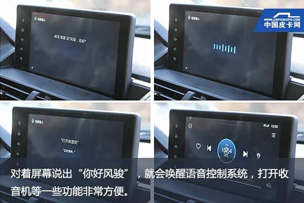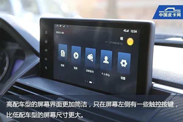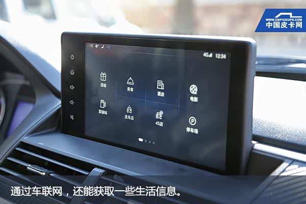 高配车型上则是另外一个系统,功能更强大,界面也更简洁。首先这个屏幕是一块“互联网屏幕”,就像一个手机,很多软件都可以联网使用,比如导航、查询违章、网络电台、生活资讯、在线升级。另外它还能语音控制,可以唤醒导航、多媒体、电话、新闻、汽车服务和生活服务等多种在线服务,而且在车机语音播报信息的时候可以直接打断,让它进行下一步操作,让整个的控制过程更高效。能够在一款皮卡上有语音控制而且还能联网,实数少见,可见这款车已经非常乘用化家用化,并不是简简单单的一个回本利器。