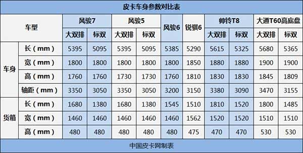 另外,有卡友关注这款车与现在几款比较受关注的皮卡尺寸对比,下面我把参数都列到了同一表格中,这样看上去非常直观。风骏7和风骏5在长、宽、轴距和货箱大小都相同,只不过比风骏5高了一些;风骏7大双排比风骏6轴距长,车身长,货箱长,但小双排比风骏6要短不少。其他车型大家可以自行比对,一目了然。可以说,除了一些比较大号的皮卡,风骏7的大双排和标双的尺寸仍然算是主流。如果您家里有表格中的皮卡,这样对比下来应该对风骏7的大小有个大概印象。