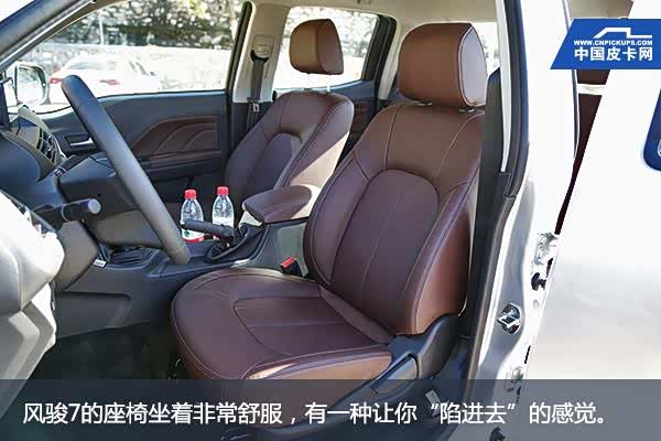 另外,风骏7的皮质座椅坐上去也很舒服而且柔软,能够让你“陷进去”,从试驾开始到结束一天的时间,坐着并没有感觉到累。而就在我们试驾结束后,叫了一辆宝骏510打车到高铁站,坐上座椅的瞬间就感觉到了差距,板正的坐姿和比较硬的靠背让我开始怀念风骏7的座椅。这并不是我要故意夸风骏7,如果您附近的店里有风骏7的样车了,可以找机会坐一会儿试试。至于后排座椅的空间,在这个紧凑型皮卡中,不会有太夸张的地方让你翘二郎腿,属于一般水平,中规中矩。