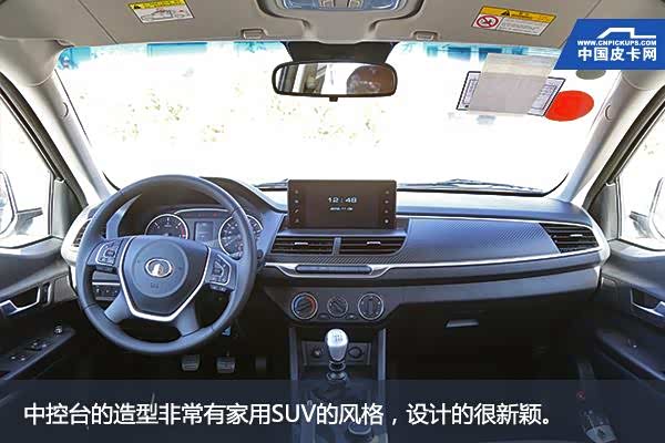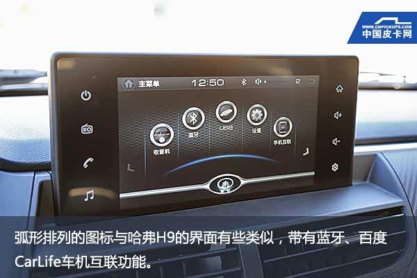 内饰部分是挺值得说的地方,首先中控台的整体设计非常乘用车化,最最重要的一点就是独立中控屏的设计,长城也直言不讳的称风骏7为中国首款悬浮屏皮卡,确实很新颖。这个屏幕很有意思,根据高低配的不同,系统也不相同。我们试驾的低配车型中控屏系统界面很像哈弗H9,圆弧形排列的图标看上去很有设计感。在这个屏幕上带有蓝牙功能、百度CarLife车机互联功能,可以播放手机中的音乐,已经摆脱了“只是个屏幕”的简单作用了。而且屏幕中的字体都很注意美化,样式很新颖时尚。