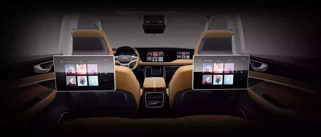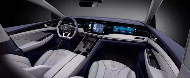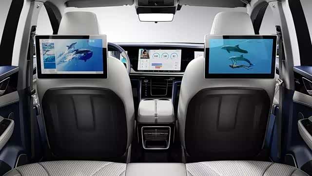 记者在现场看到,“星空互联豪华座舱”的前排拥有3块大尺寸屏幕,构成长达1.46m的影院级沉浸式的视觉空间,加上正副驾座椅背后的2块屏幕,形成了“五屏即时互联”显示内容自由切换的极致场景。