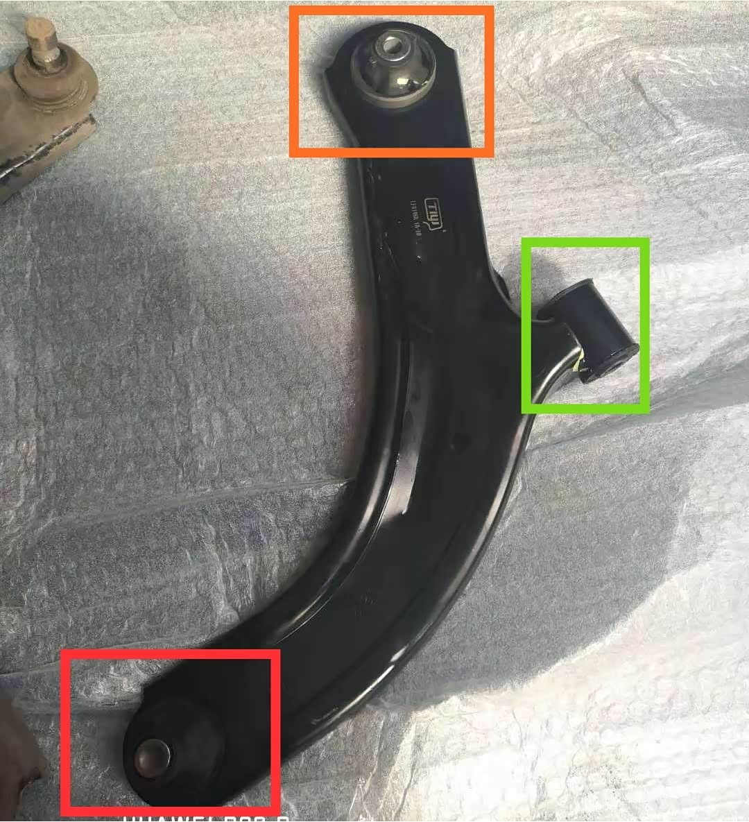 师傅表示,外行人看着半轴是断了,其实半轴只是内球笼分离了,内球笼内部没有磨损,只用换一个防尘套就可以了!下图所示,这是新下支臂。旧下支臂就是绿色区域的位置断裂,橙色区域在副车架上安装,红色区域在转向节上安装。