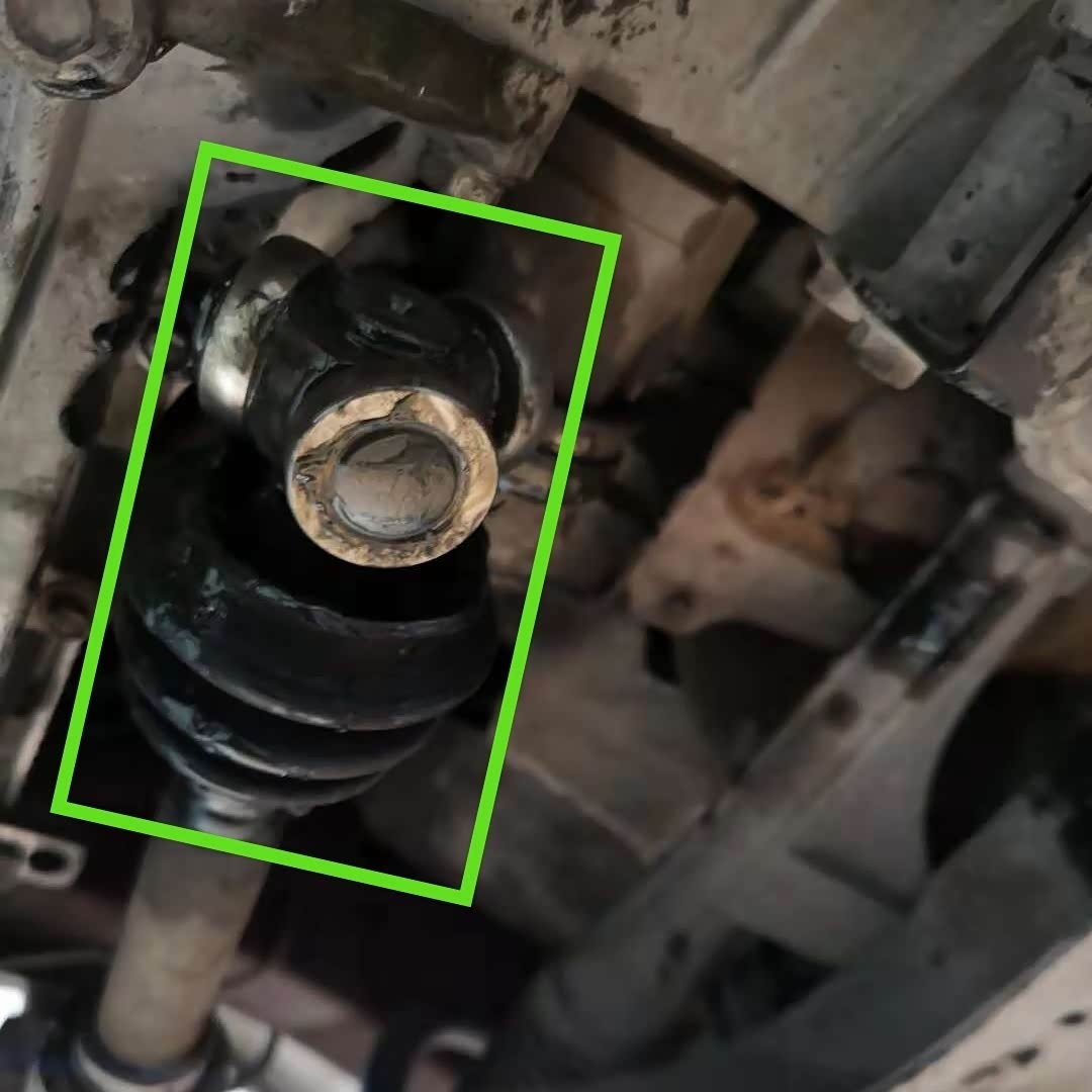原来,这辆日产底盘的下支臂被蹭断裂,导致轮胎外移,把半轴内球笼给拉开了。如下图绿色所示,这也就是我们说的断轴,很多车断半轴都是这样的类型,绿色区域所示的是半轴内球笼内部的情况。师傅在发现半轴断了,车无法移动后,刚好旁边有电焊机,就把断裂的下支臂焊接到原来的状态,然后就把车移动到救援车上。