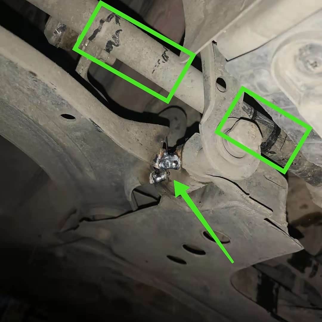 半轴断了之后,汽车是无法移动的状态。那么,师傅是怎么把这辆日产移到救援车上呢?下图所示,这辆日产骐达的右前部,注意看绿色箭头所示的位置,师傅救援时焊接的下支臂。看到这里,小编明白了师傅说的原因。