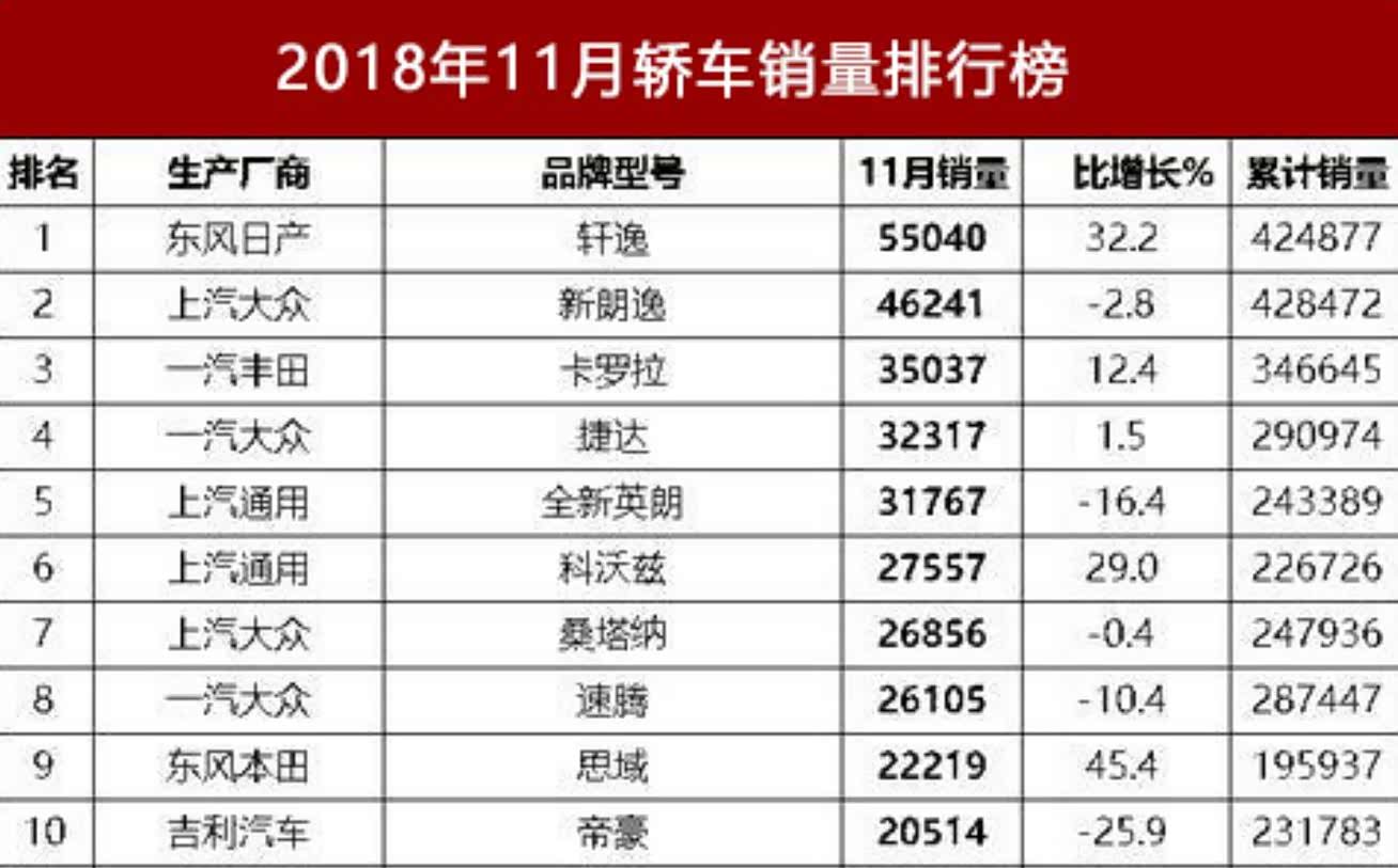 首先咱们来聊聊合资产品们。一台车好不好,其数据终究不会骗人,在最新的2018年11月轿车销量排行榜中,日产轩逸以月销55040台的成绩,将之前一直占据榜首的大众朗逸拉下,而第三名则被一直在发力的丰田卡罗拉所霸占。由于轩逸和朗逸销量的暴增,销量环比有所增长的别克英朗,则在11月份大排行中下滑了一点点。