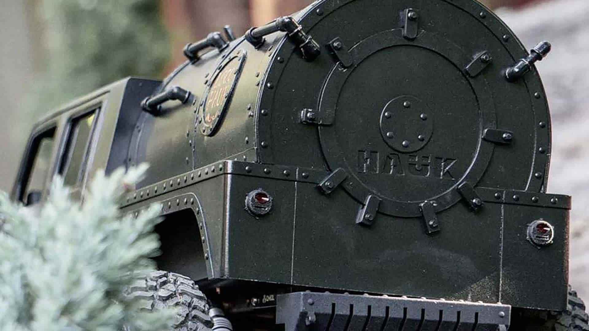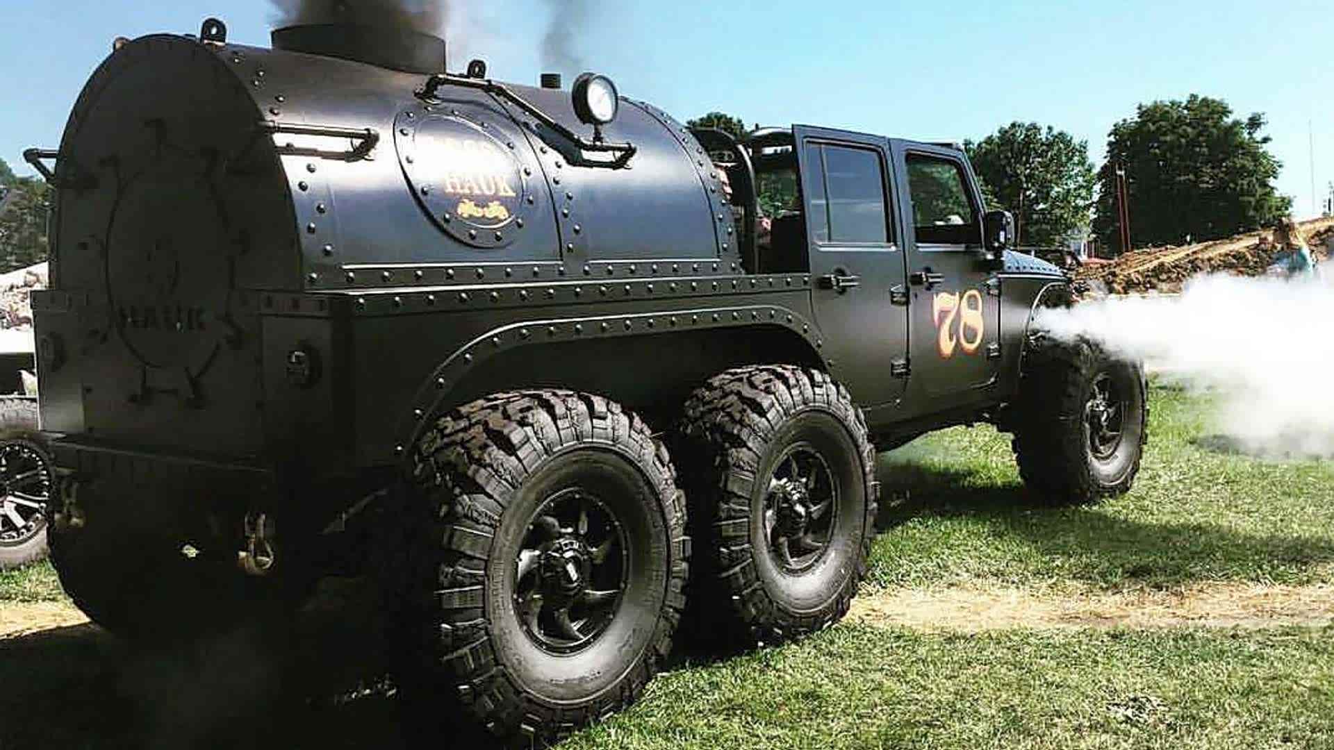 外观来看,6X6的造型已经说明了一切,它已经属于高阶改装玩家证明自己实力的一种表现。但这还不是他的重点,这款由Chambersburg公司改装,名为Loco Hauk的最大的亮点是它的的动力系统—一台100ci V-4单缸蒸汽机,而且与之匹配的是一款手动六速NSG370变速箱,最高时速可达56km/h。