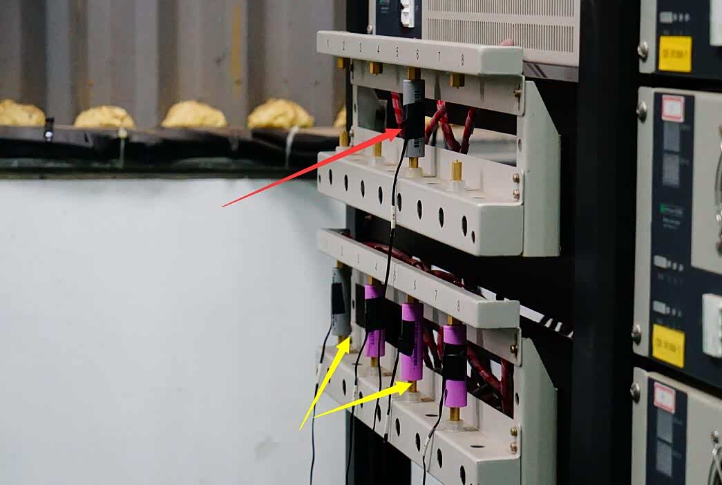 黄色箭头:连接方形三元锂电芯(75安时)正负极,进行常温环境充放电循环测试