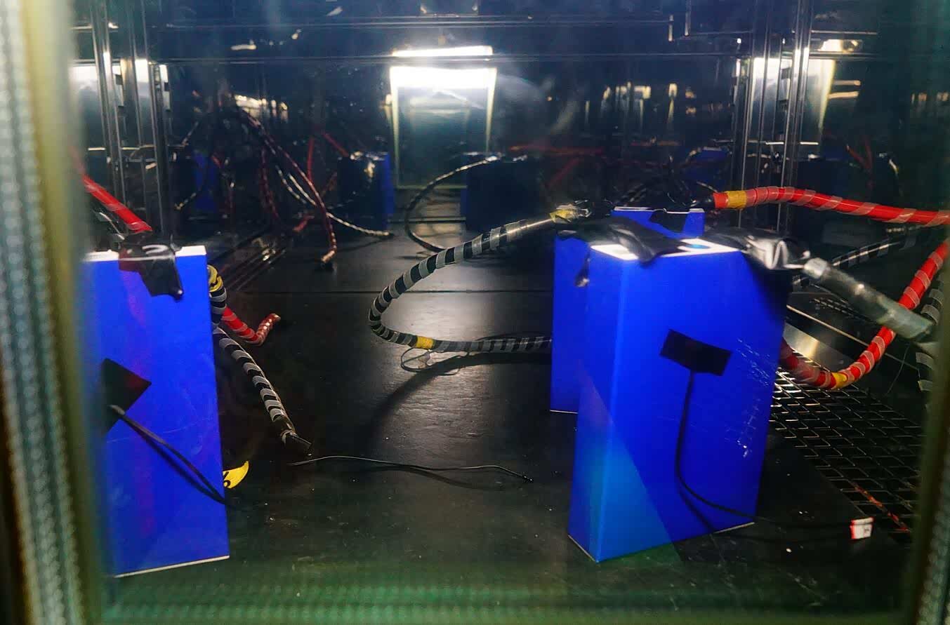 上图为进行高温环境的方形105Ah磷酸铁锂电芯的充放电循环测试细节特写。