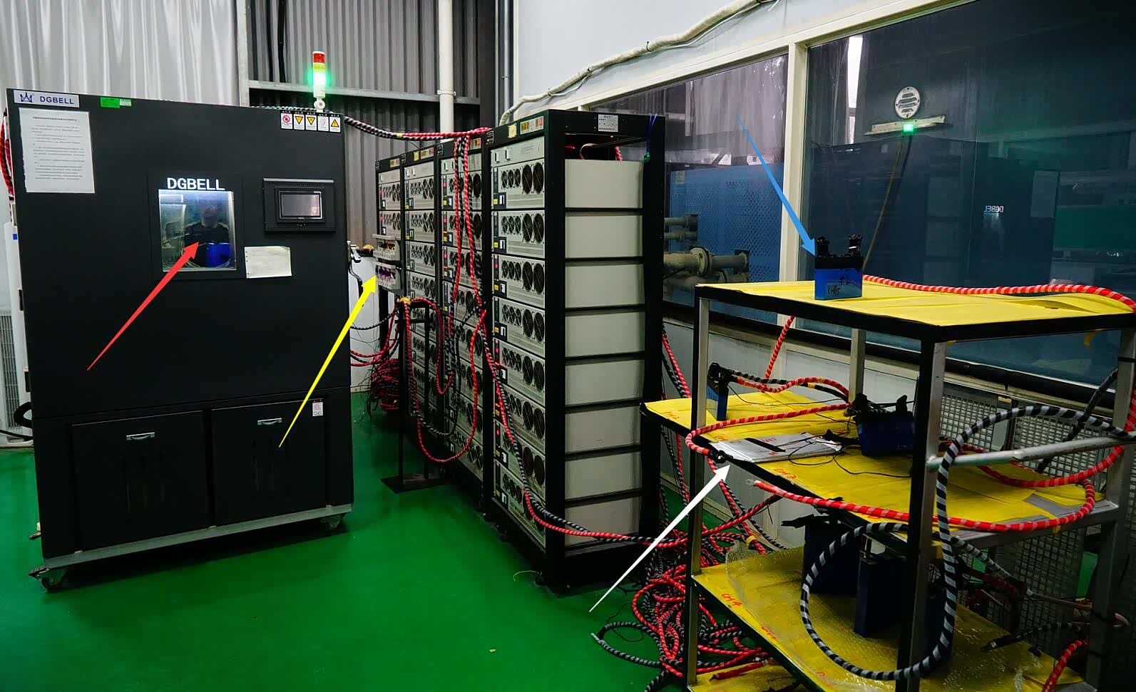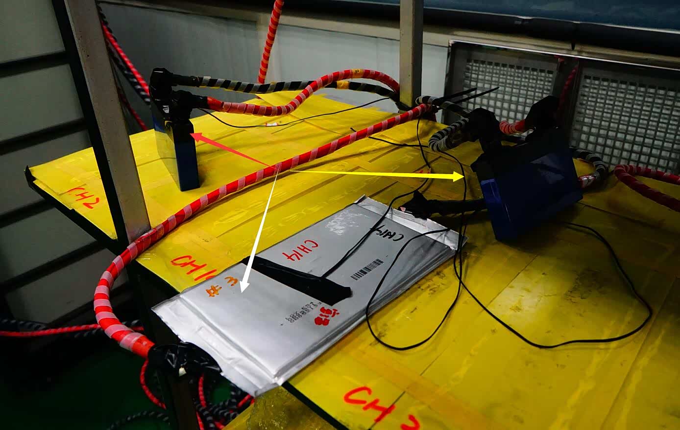 红色箭头:连接方形磷酸铁锂电芯(105安时)正负极,进行常温环境充放电循环测试