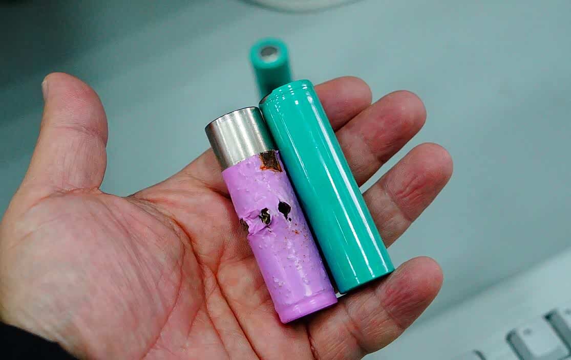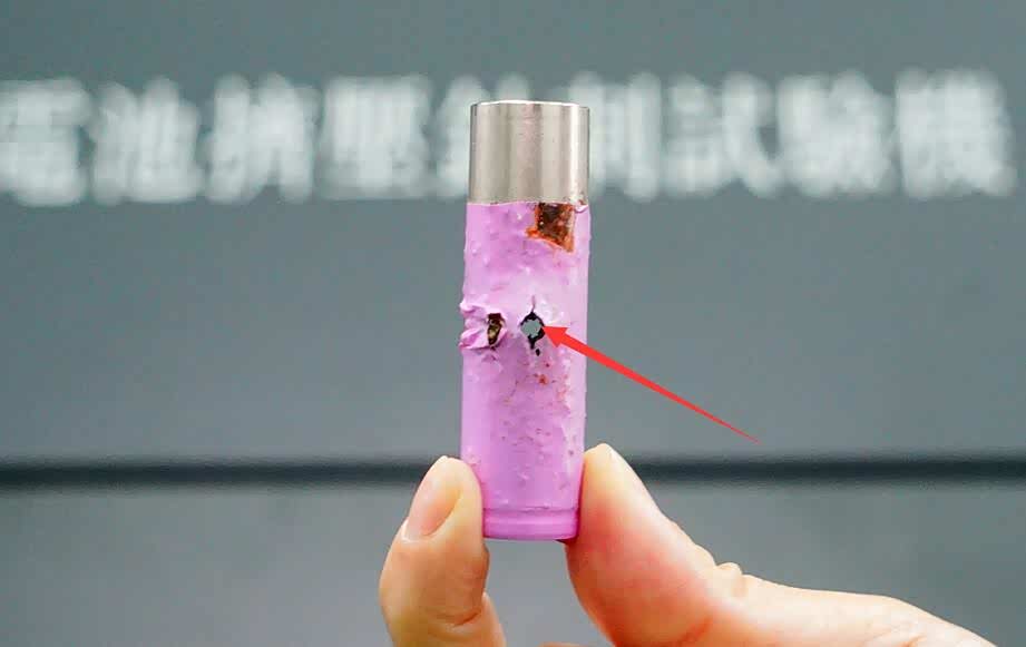 上图为经过针刺测试后,18650型三元锂电芯特写。