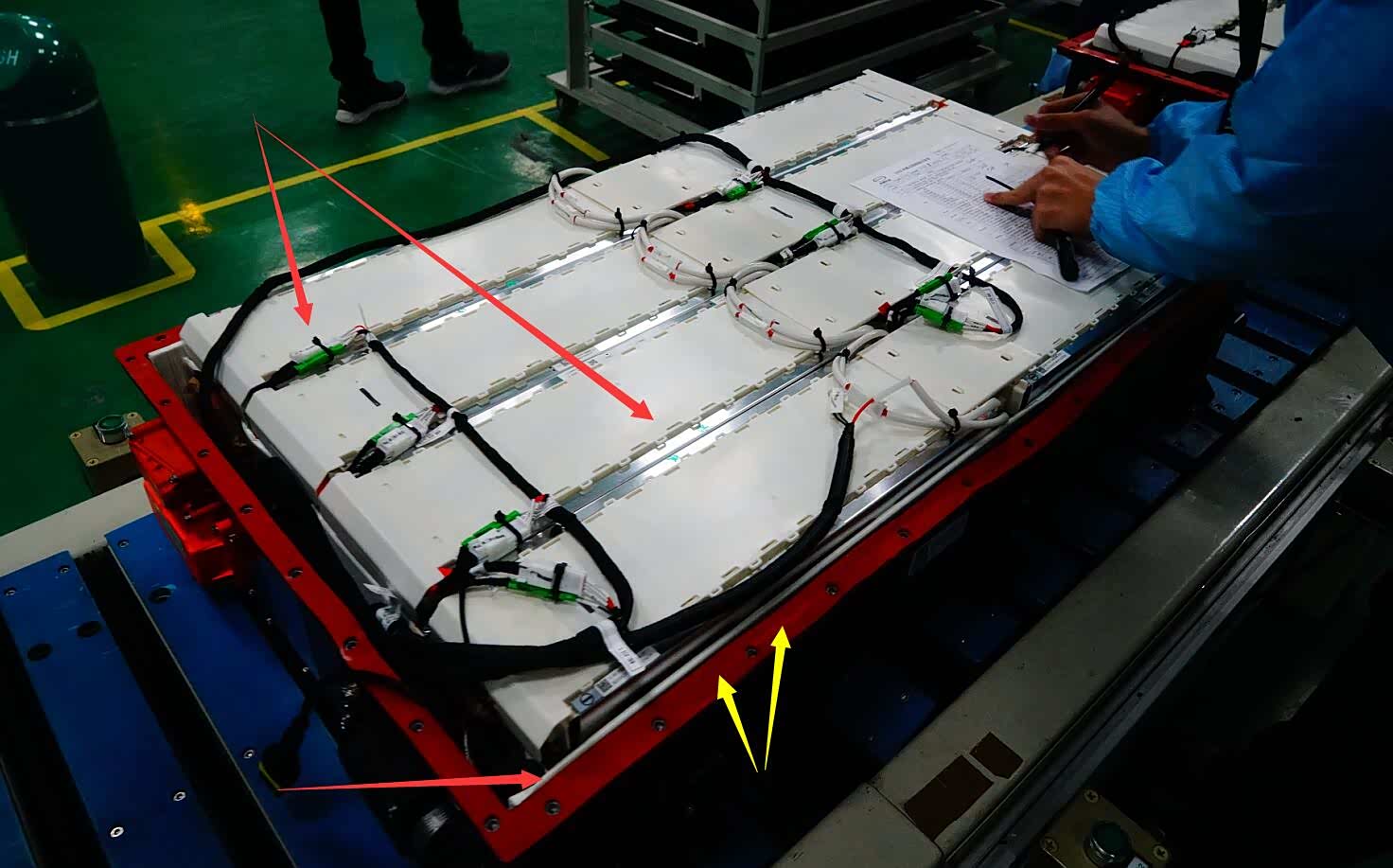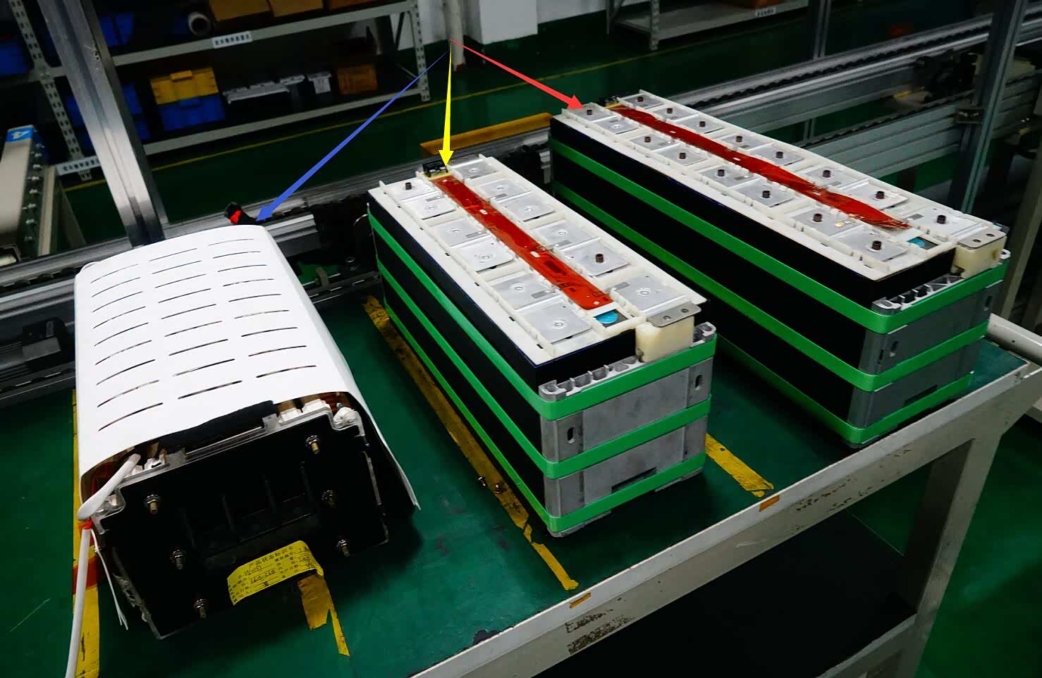 红色箭头:8串280Ah方包磷酸铁锂电芯串联的PACK半成品