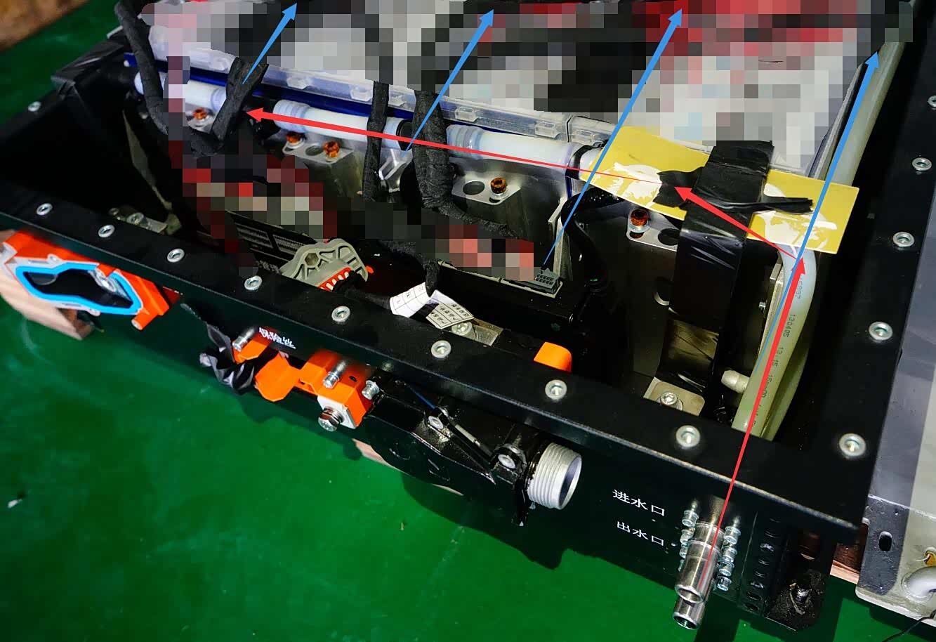 红色箭头:与进出水口关联的塑料冷却液管路(与围绕电芯的铝合金液冷板连接)