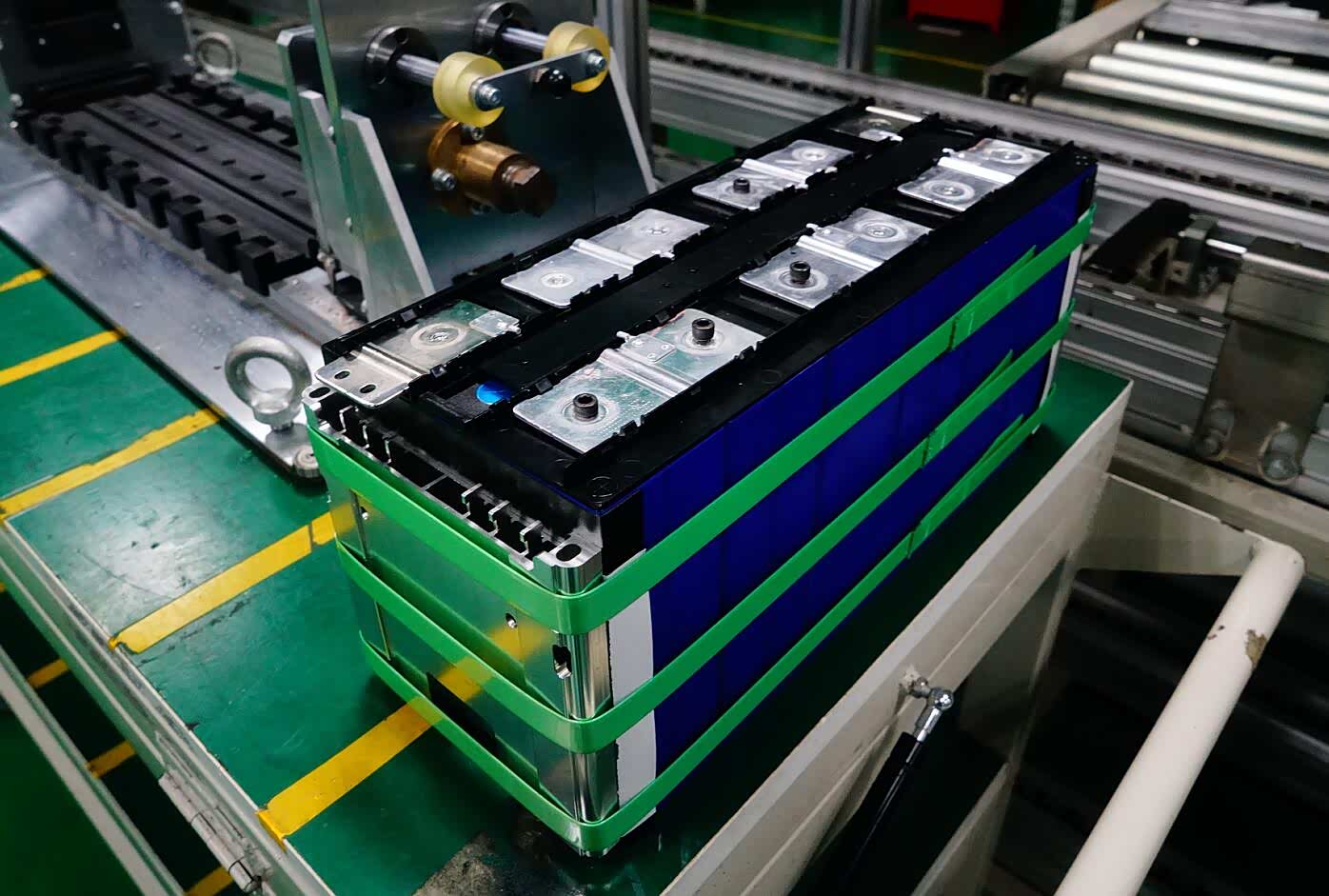 上图为待合装至PACK的6串280Ah方包磷酸铁锂电芯细节特写。