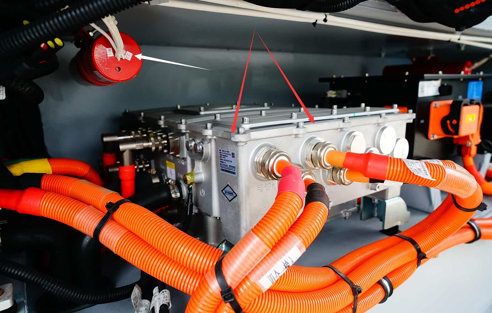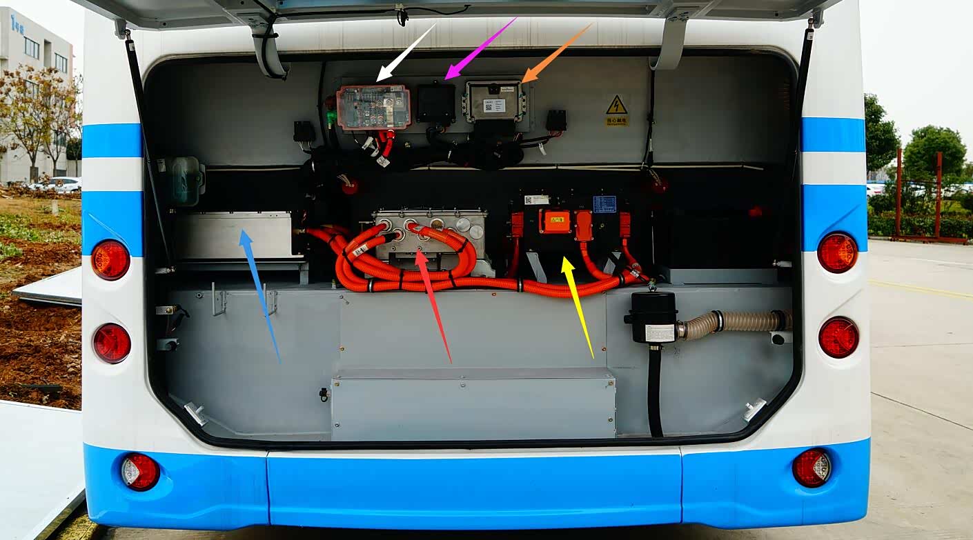上图为开沃NJL6101EV型电动客车动力舱各分系统细节特写。