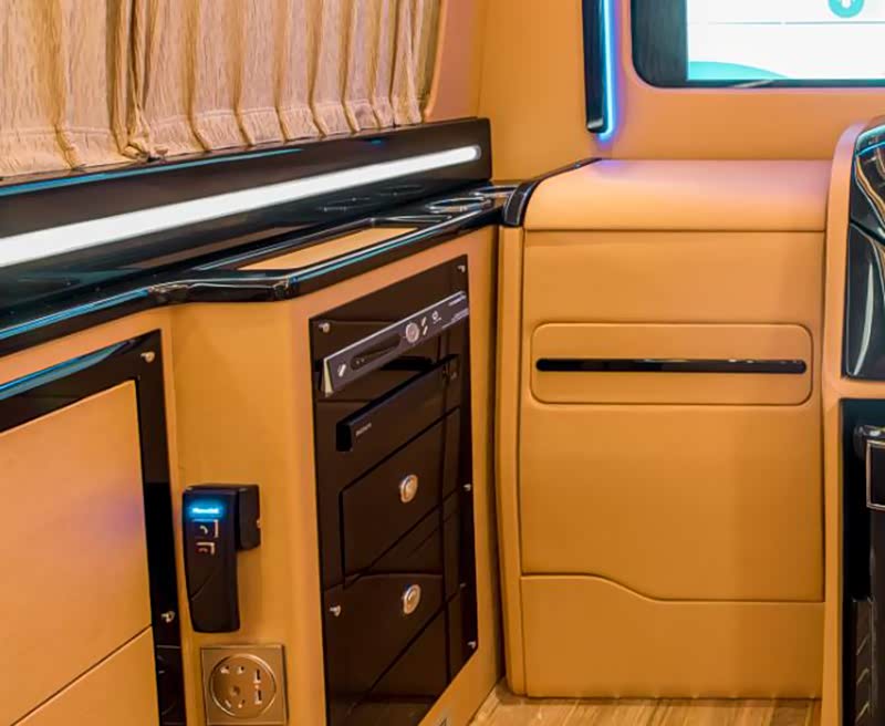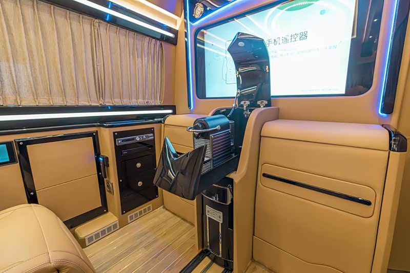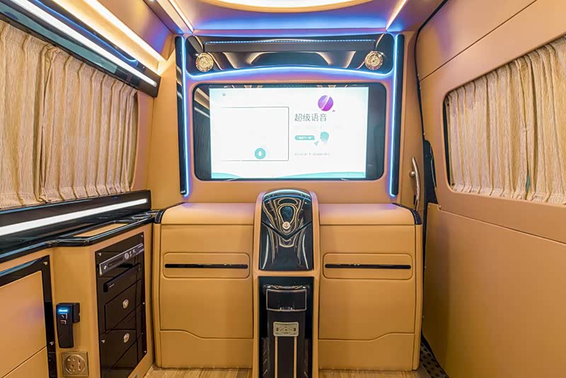 首先是跟驾驶室做了隔断,42寸大屏智能可升降液晶电视,上网、办公、电影、听歌,一网打尽!