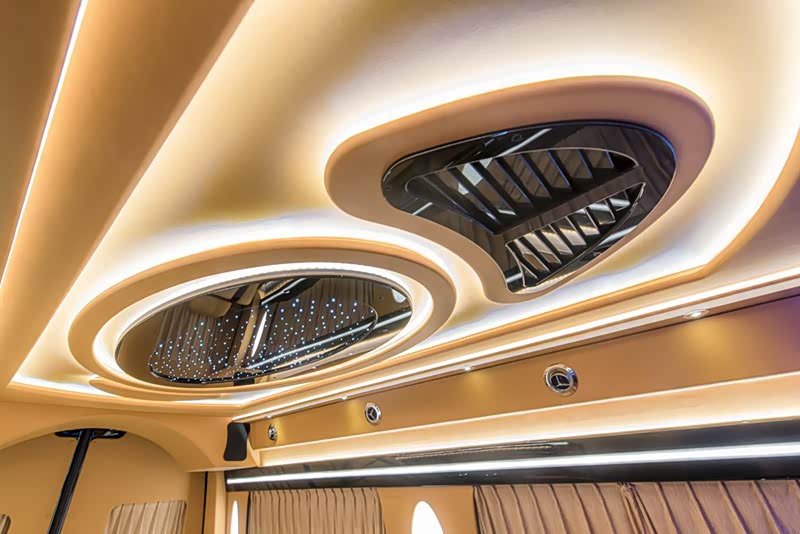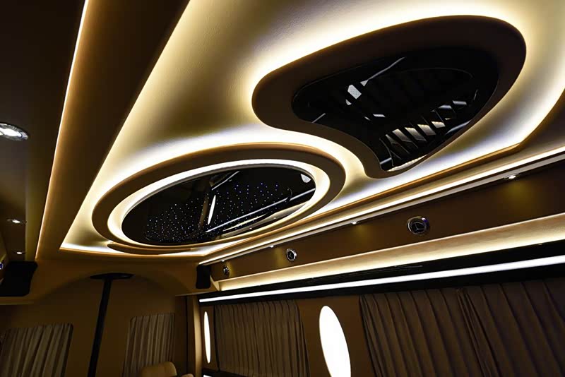 车子顶灯也做了改装,跟车子内饰风格保持一致,豪华绚丽,还带星空顶,可以跟贵宾会议室灯饰媲美了!