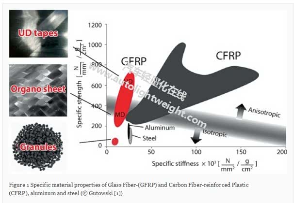 连续纤维增强热塑性材料由纤维和基质组成。纤维特有的材料特性提供了高轻量化设计潜力,如图1所示,而热塑性基质加工时间短,因此可以实现大批量。有机薄片和带之间有所区别:如果纤维主要沿一个方向排列并以薄层形式提供,则它们被称为单向带(UD带)。然而,如果纤维结构是多维的,例如通过经线和纬线或通过将不同的纤维取向彼此缝合,则这些是所谓的有机片。