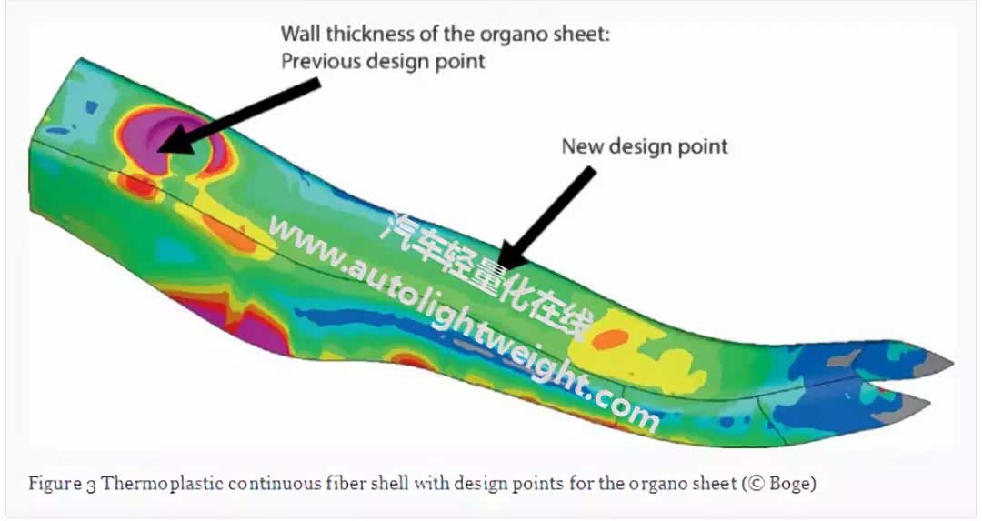 随着产量的增加,部件成本渐近地接近材料成本,而部件成本是决定制造成的主要因素。因此,决定是否应用有机薄片或UD带取决于单价方案。Boge Elastmetall与合作伙伴Celanese,Cevotec和M.A.i合作,成功制造了用于批量生产的安全部件的UD带增强件,以满足汽车行业的要求。结构仿真采用单层仿真方法结合运动垂直仿真和拓扑优化后塑料包覆成型的附加建模。批量生产基于两阶段工艺,具有扁平带堆叠装置和随后的覆盖,分别在一个工艺步骤中重新固结而无需中间固结。在随后的工艺步骤中,可以使用Boge Elastmetall开发的组合工艺作为使用注塑料进行全自动成型,再固结和包覆成型的基础。