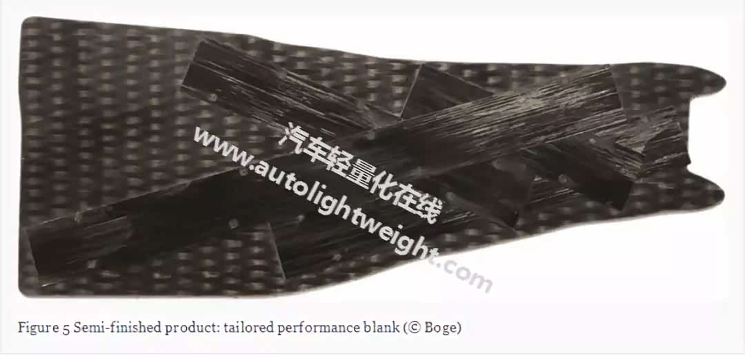 制造过程分为两个阶段:第一,由有机板和纤维带制成的定制坯料,即所谓的定制性能空白。有机板坯作为稳定的基座,UD带的条带根据负载路径自动连接到该基座。随后,这种定制的坯料也被自动加热,覆盖,固结并用注塑料注塑成型。