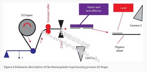 为了表示有机片中的不同纤维取向,使用纺织技术。例如,纤维在不同方向上编织或铺设,并在用热塑性塑料浸渍之前缝合。相比之下,UD带直接由纤维粗纱制成。粗纱可以从线轴上展开并直接通过热塑性熔体拉制。这种缩短的工艺流程使得半成品成本得到有效控制,使得半成品UD带具有吸引力。