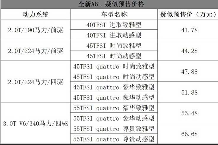 目前,根据我们得到的消息,有经销商表示全新一代奥迪A6L预售价在41万大几至66万大几之间,可以参考这个表格,但具体售价还是以上市当天为准!