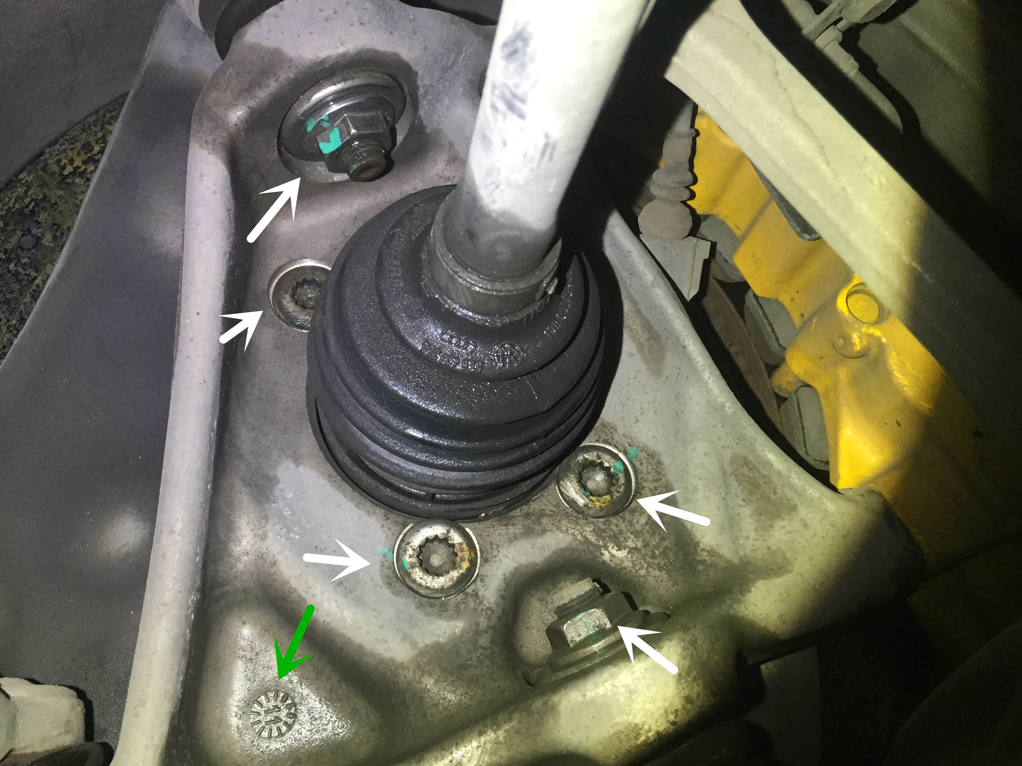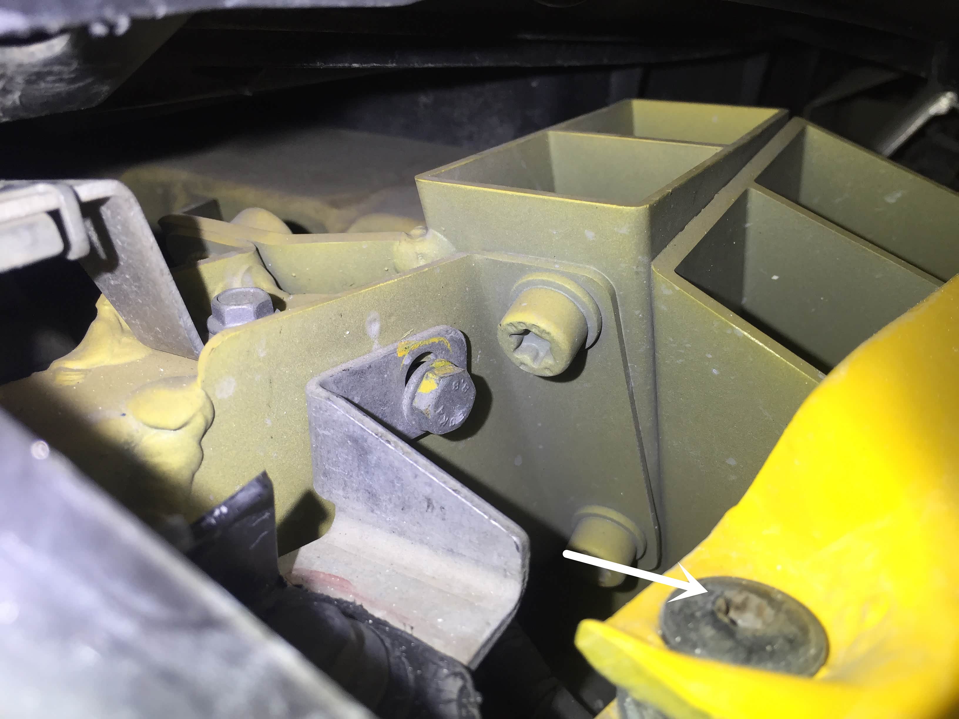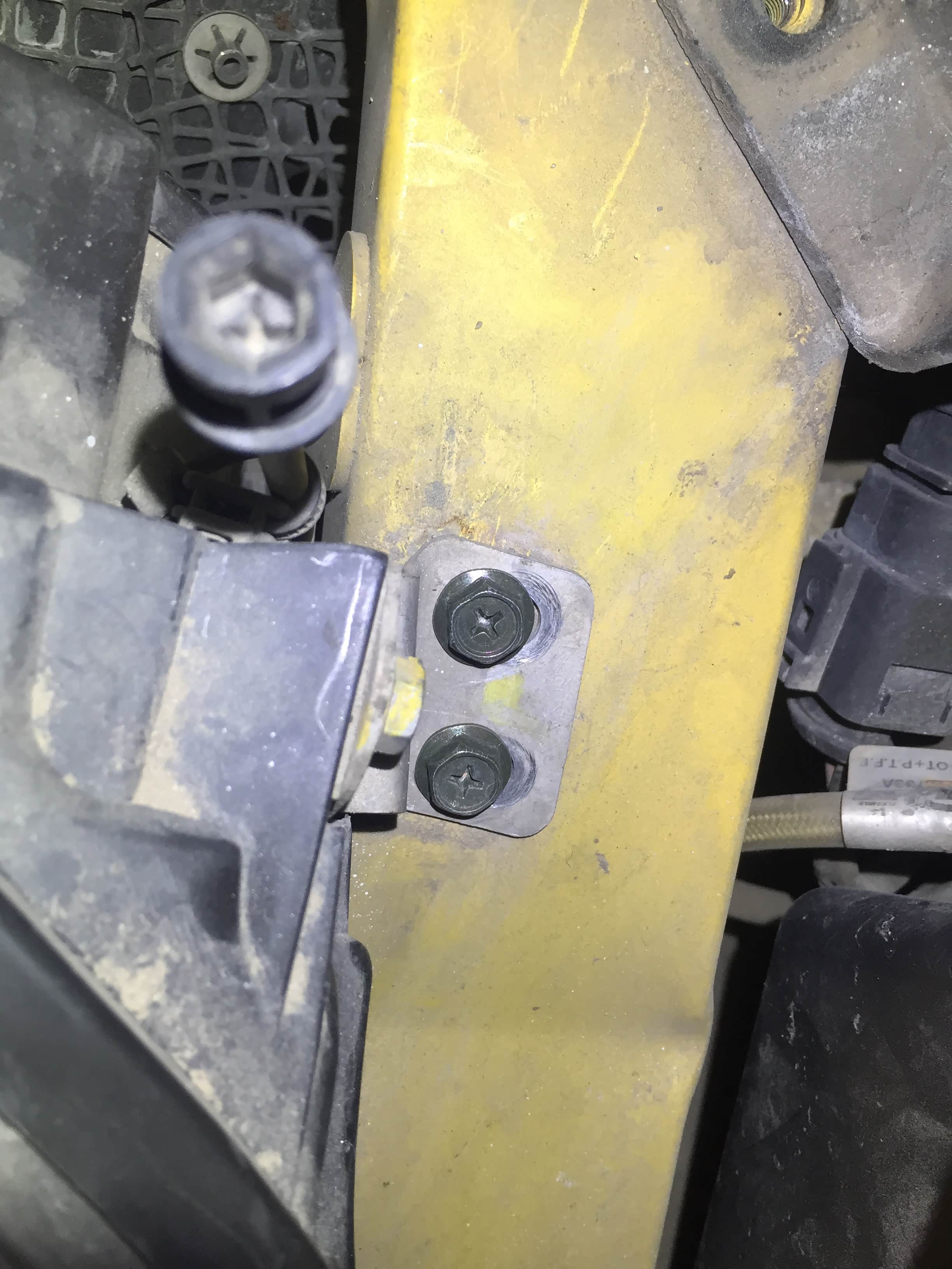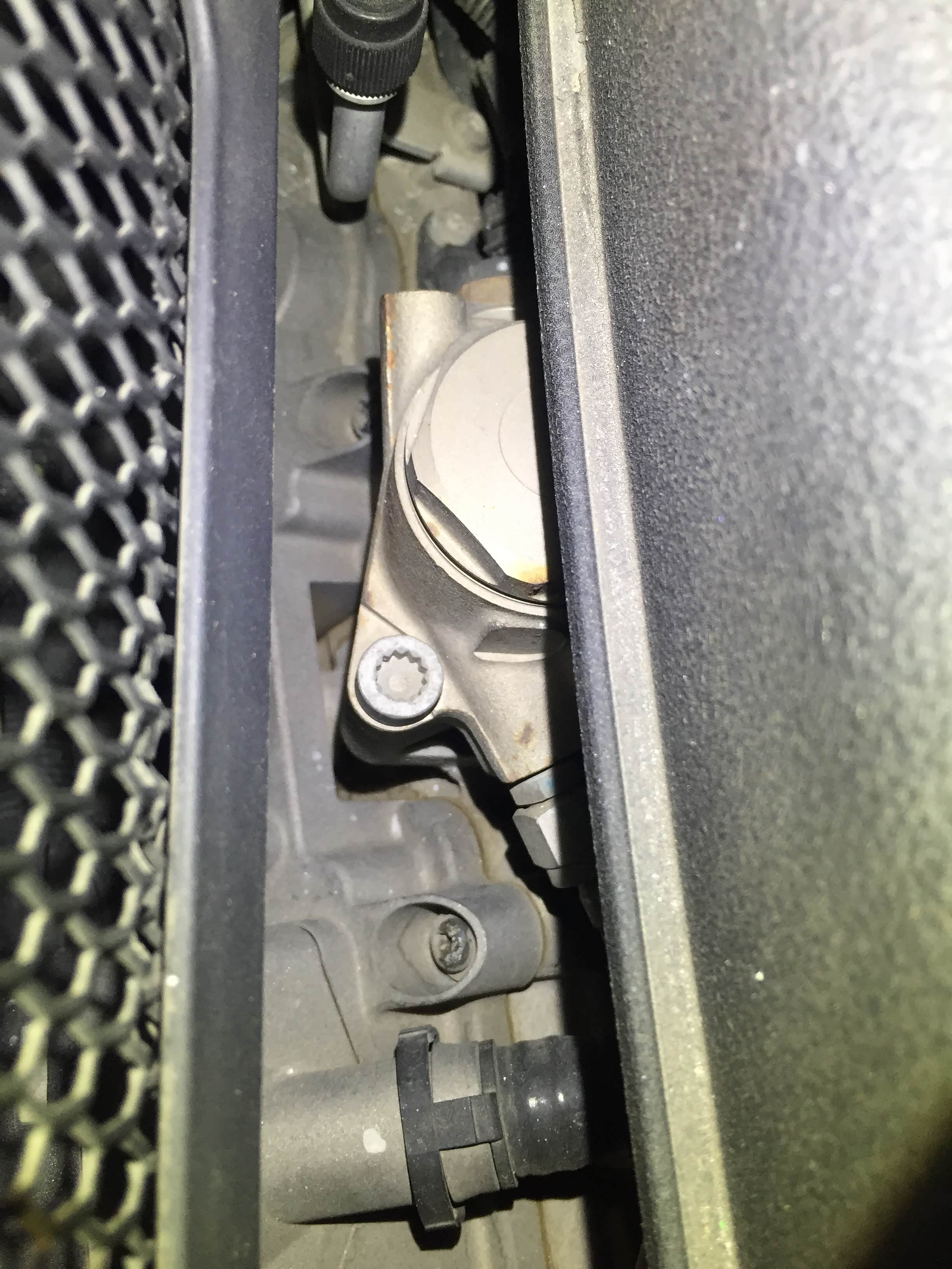 前保险杠螺栓松动迹象;车身骨架采用奥迪全铝车身技术,表面铝车身部件依据各自的功能由各种不同的方法连接在一起,包括铆定,螺栓固定以及焊接。我们检测前部骨架螺栓及焊接部位均为原厂状态。在检查前部复合车架时需拆下密封盖板,密封盖也比较不好拆卸,不拆下来检查的话基本什么东西也看不到,全部包裹比较圆实。