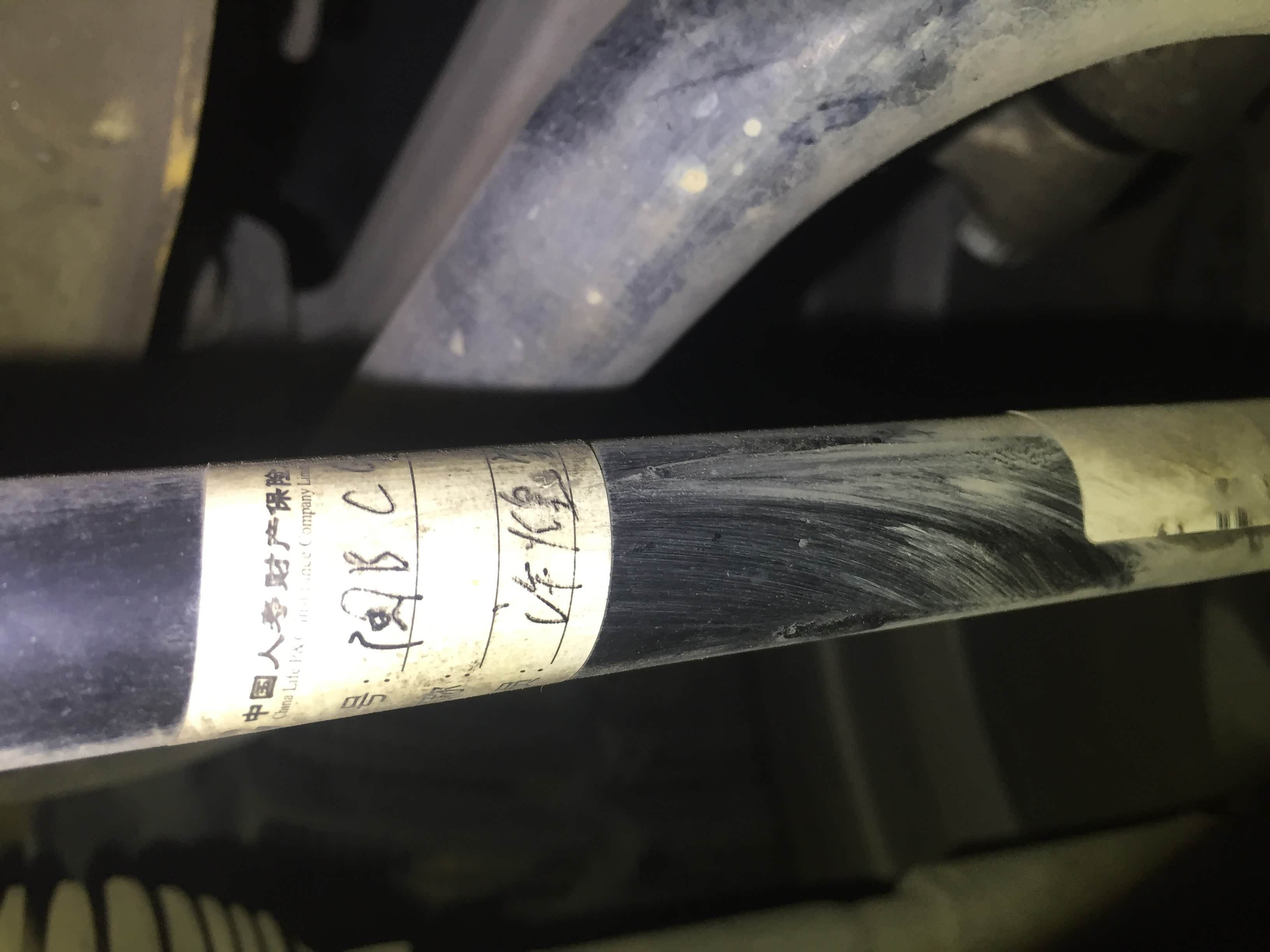 在右前半轴的背面我们发现还贴着保险标志,中国人寿保险,车辆之前是莆田牌照,那边土豪也很多,我们判断车辆有过碰撞出险维修迹象。