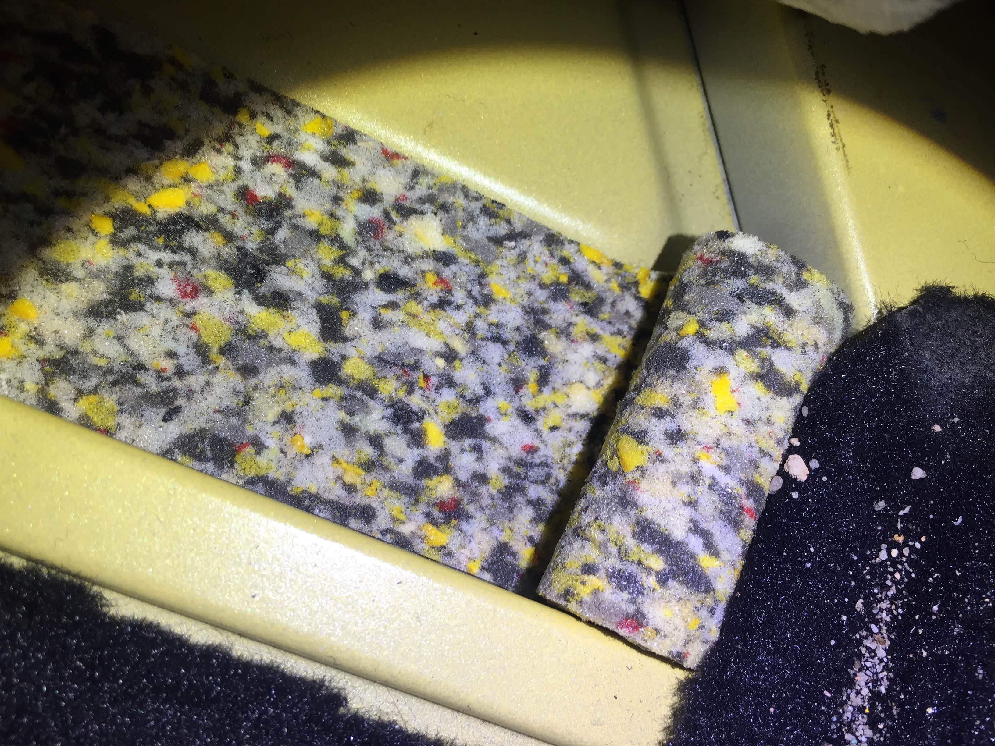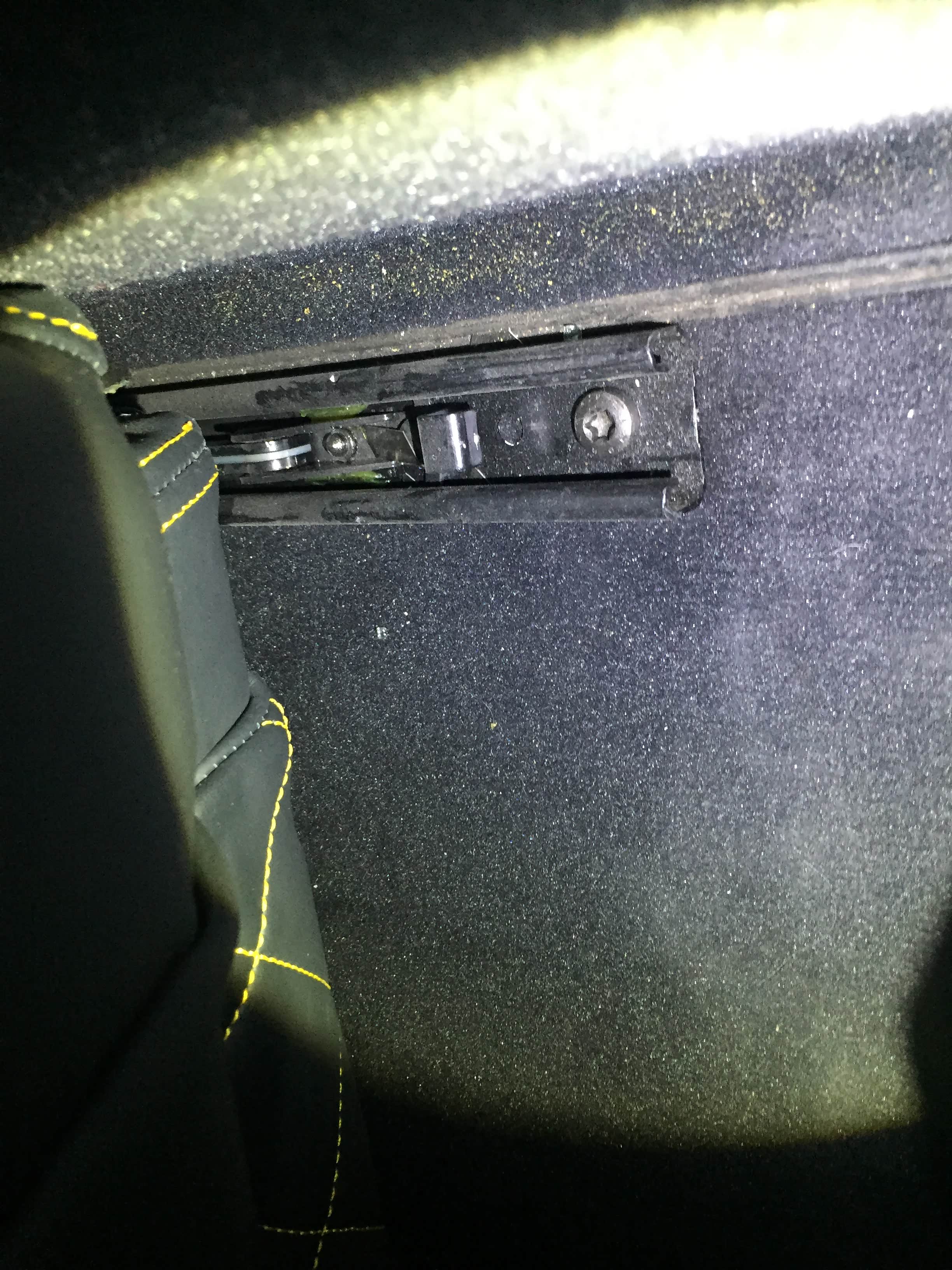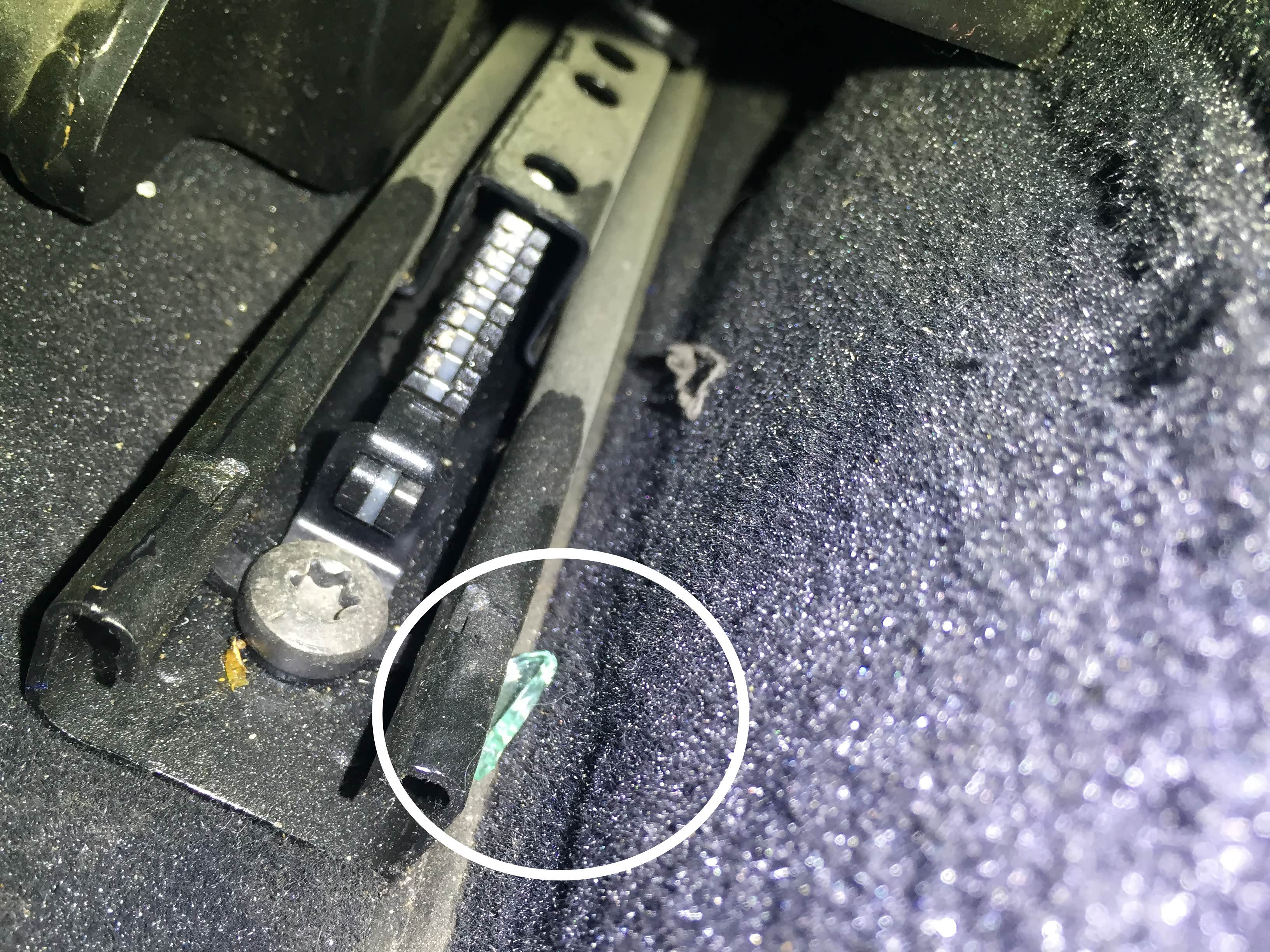我们检测前乘客时发现座椅导轨留下玻璃渣,这玻璃渣我们推断是右前三角窗玻璃更换留下来的,座椅螺栓未进行拆装,无泥沙迹象;
